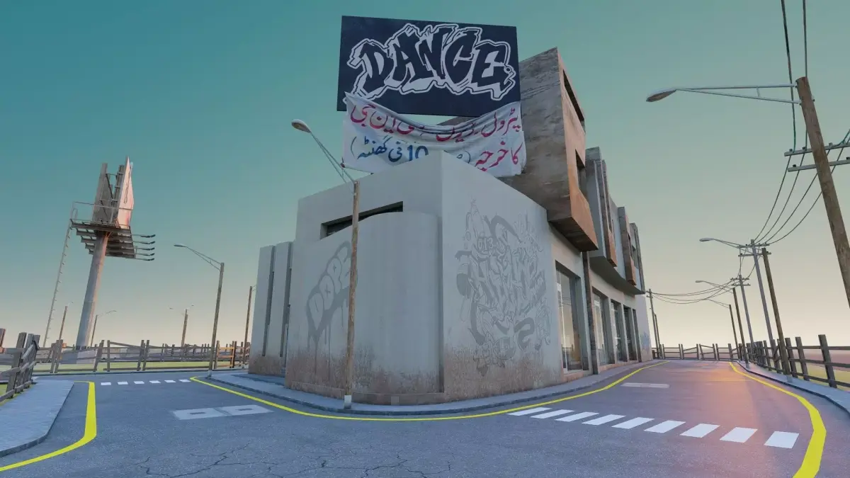This is a highly detailed 3D model of a Vice City-style urban street block, designed originally in SketchUp and enhanced in Blender 3.4 for realistic detailing and rendering. The environment includes a multi-story old building, road intersections, street lights, billboards, and fenced areas, all textured using high-resolution PBR materials for maximum realism.