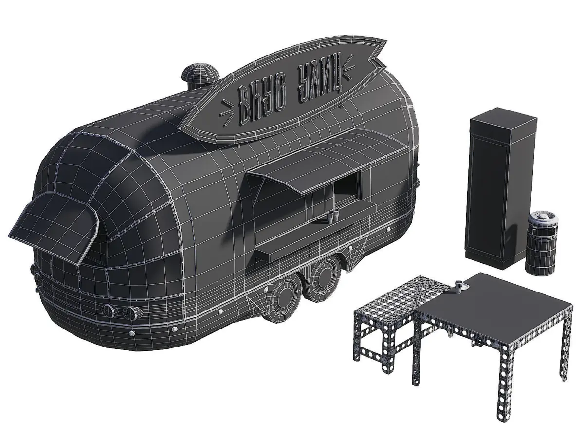 The set contains: a chrome-plated mini-van (food-truck, food truck, trailer), a refrigerator with drinks, a metal table with perforation (Soviet constructor), a metal bench, a signboard, banners with a menu, cups for coffee and a plate with a slice of pizza, a perforated bin with an ashtray, a plane with asphalt.