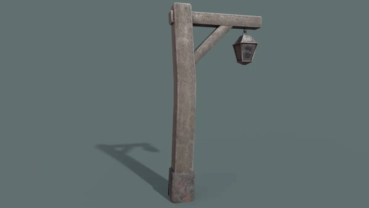 An aged iron street lamp, suspended from a weathered wooden post, stands as a silent sentinel of bygone years.