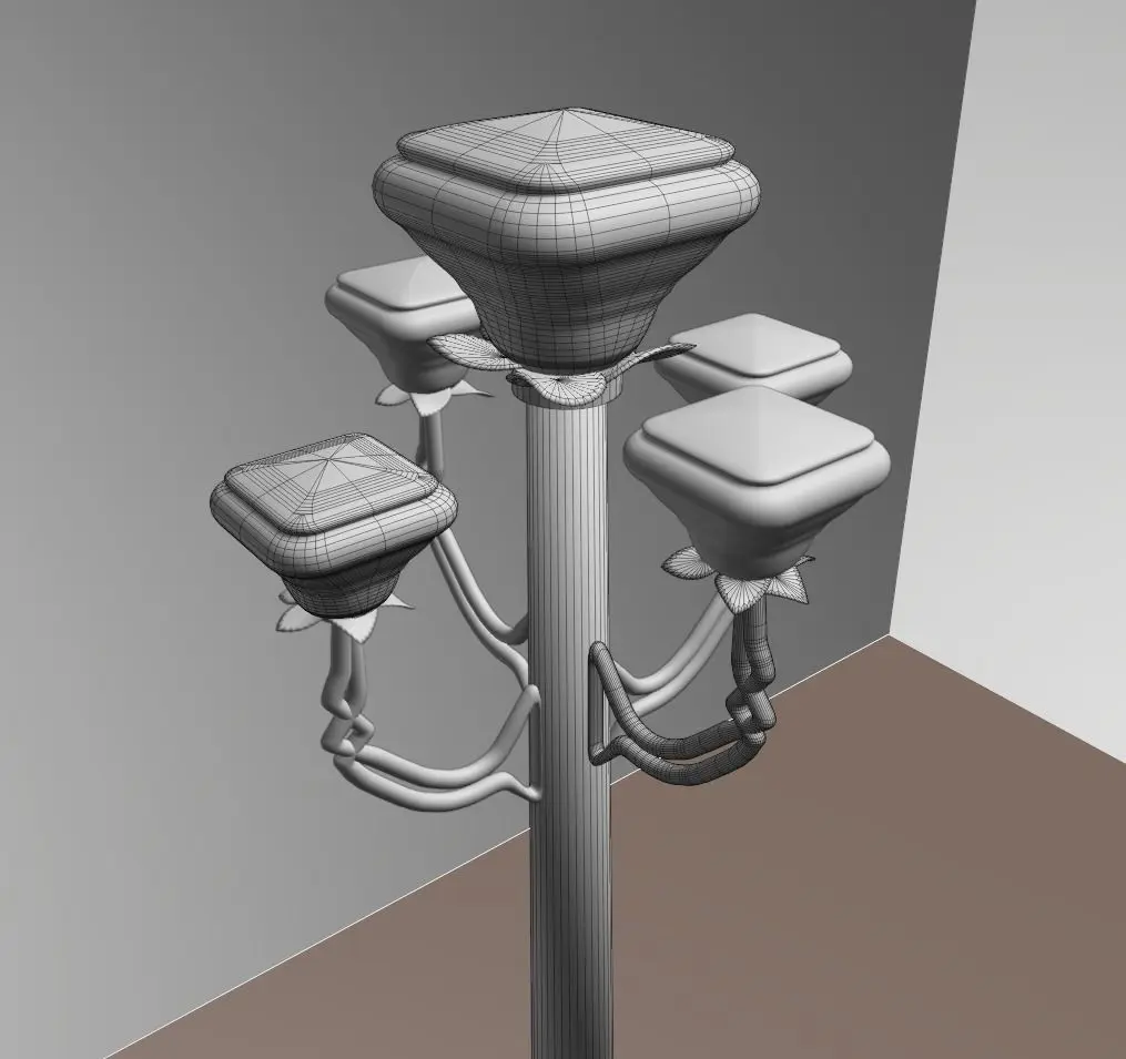 Old metal street lamp. The side lamps are separate objects, they can be removed or moved. It will look good next to a house, a tree or a road.
