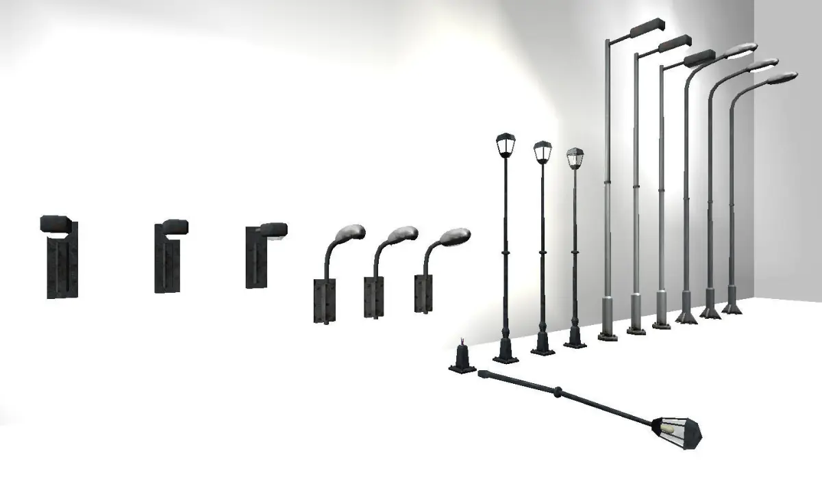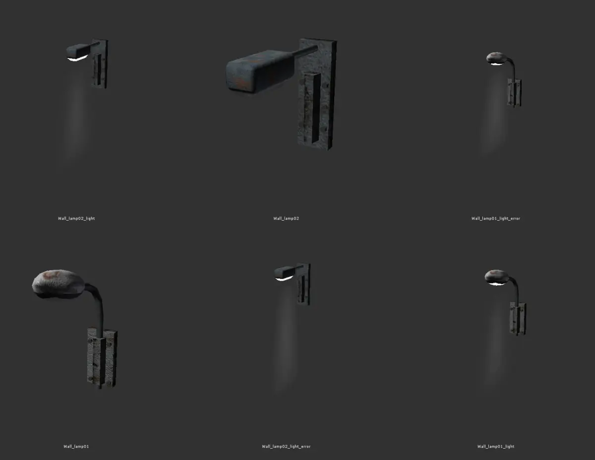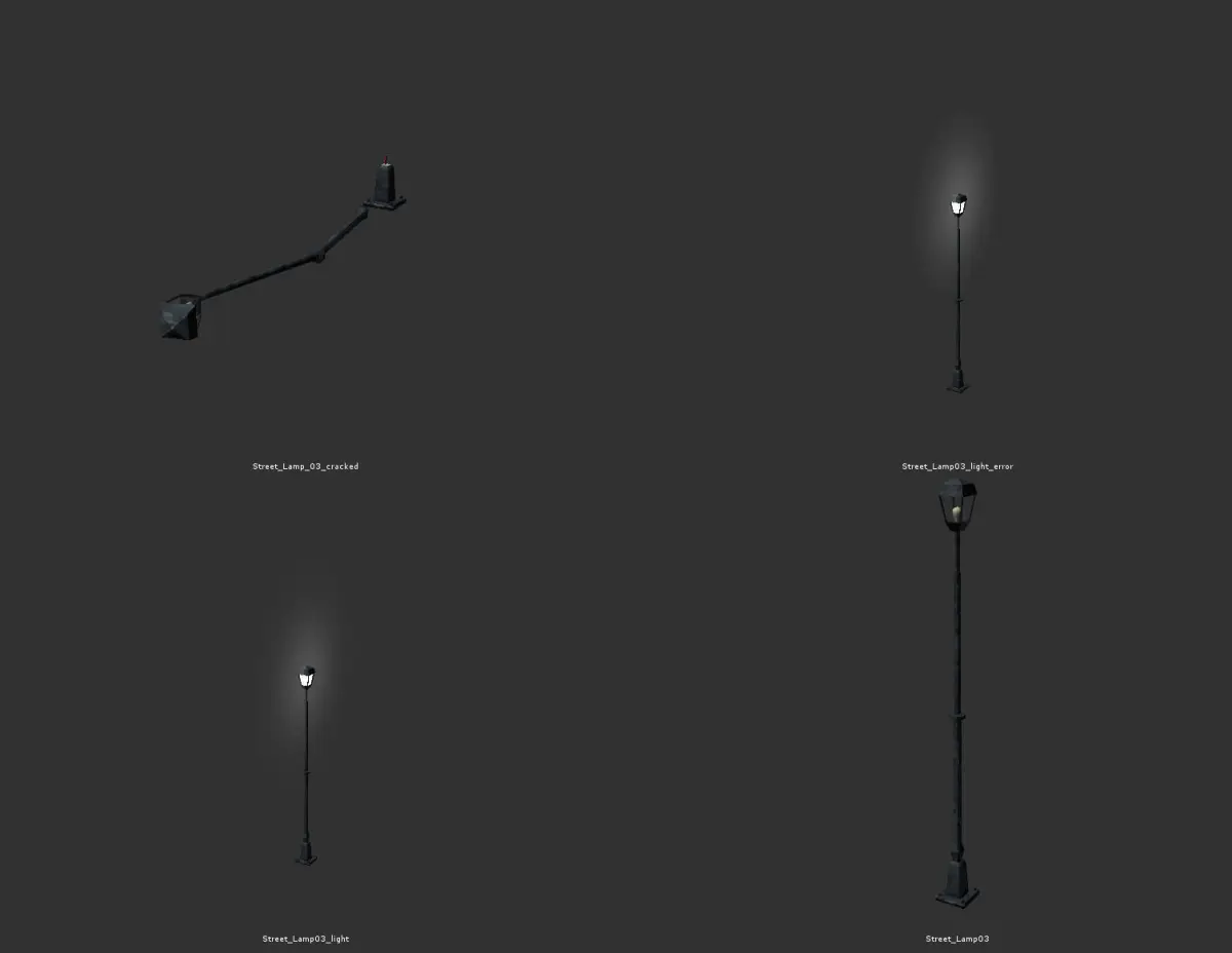 Street light set with various lamps, available for each lamps the base, lighted and error (flashing) version. The flashing version use a unique script with the light and the light cone flashing in sync. The light cone always rotote to the camera ( what you can setup as Camera To Look At in inspector) Please see the sample scene.
