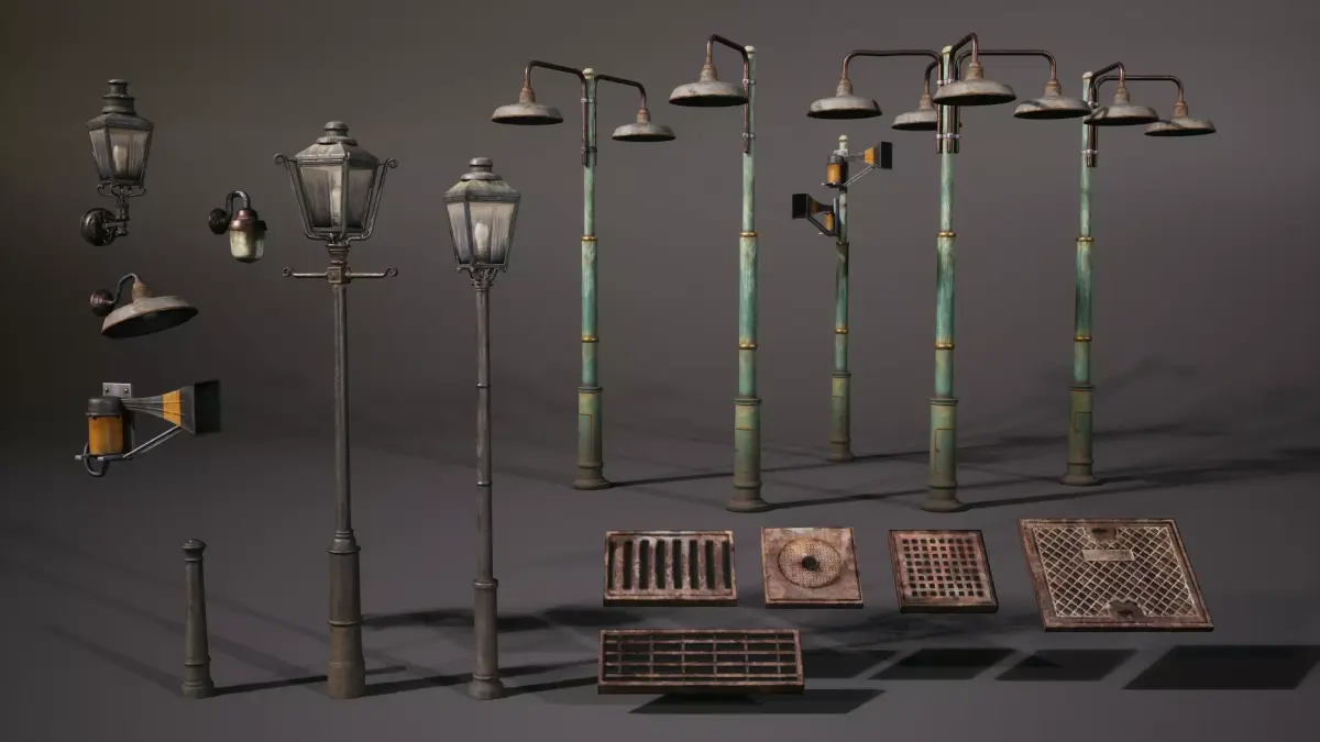A detailed collection of 19th-century inspired street lights and urban drain grates, designed for realistic historical or steampunk-style environments.