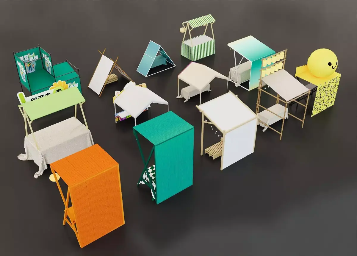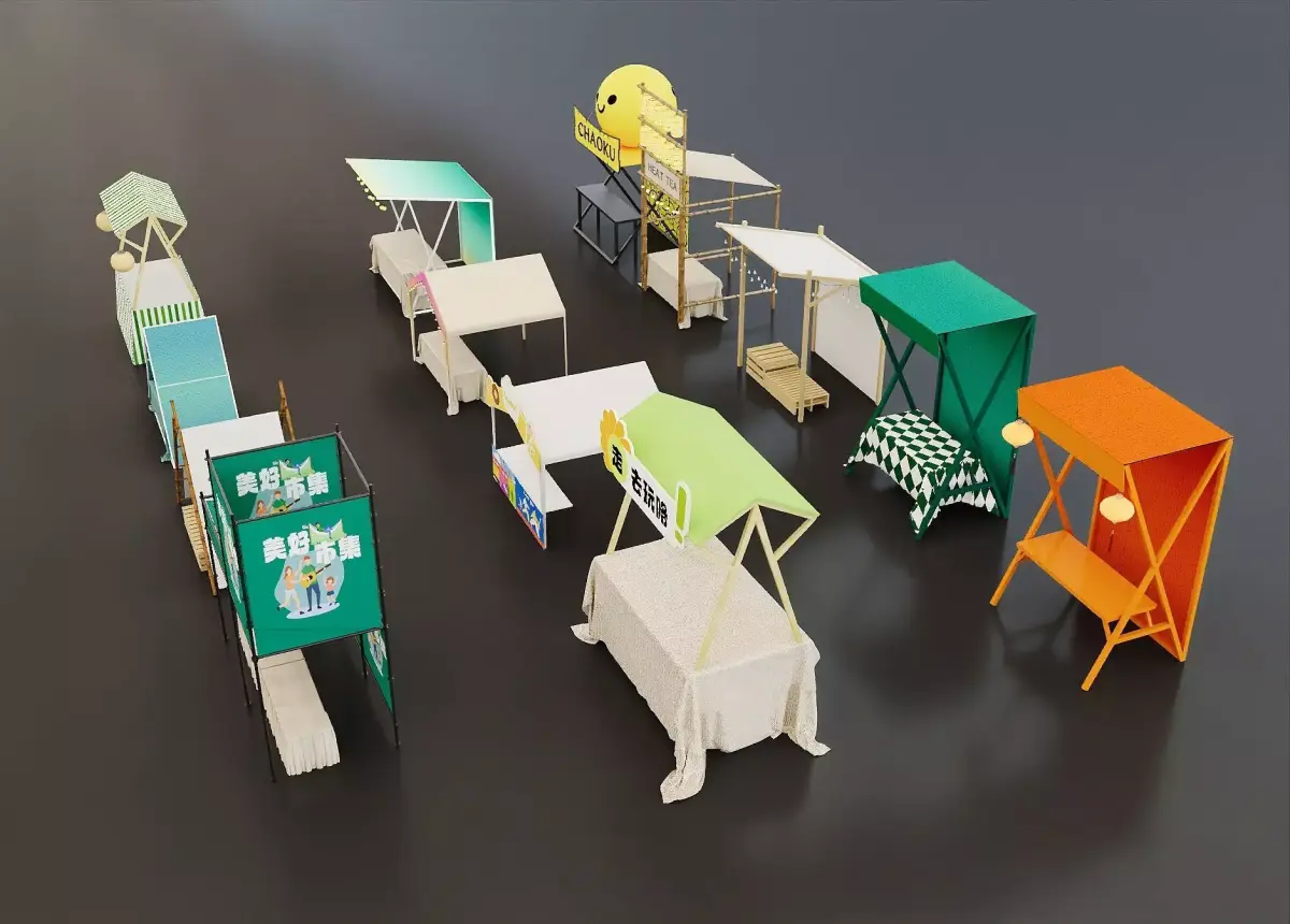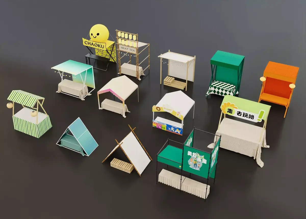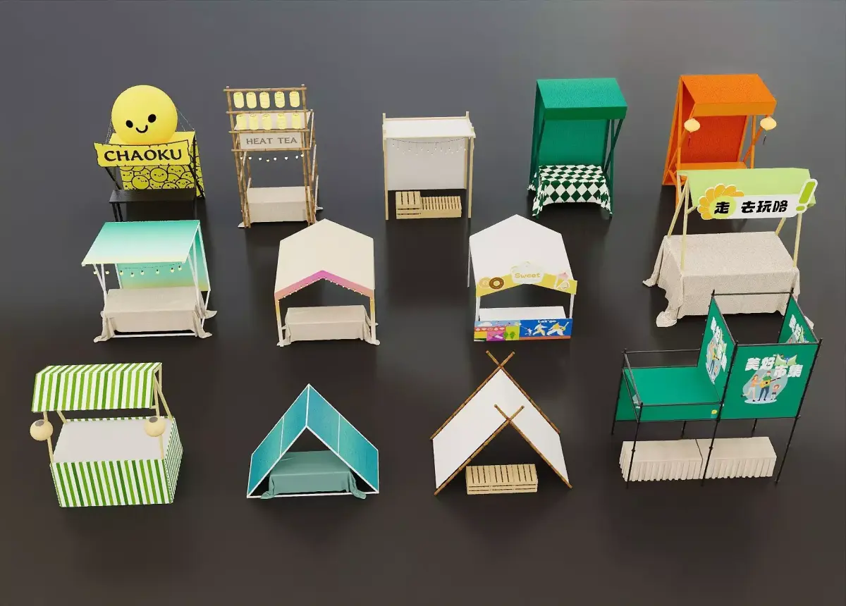 A Street Market Booth Collection featuring a variety of colorful stalls, tents, and pop-up stands designed for outdoor fairs and events.Each booth includes unique structures such as striped canopies, food stalls, tea stands, and creative vendor tents, perfect for visualizing commercial streets or festival setups.