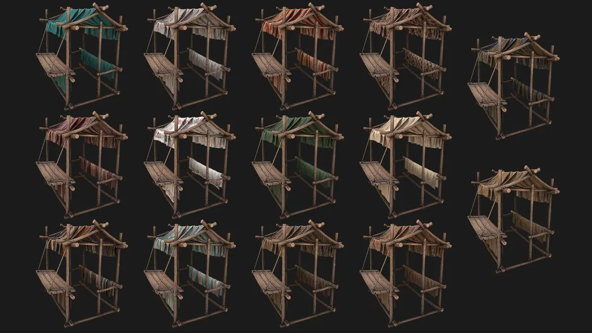 Game ready model. Market Stalls Pack fully textured, sculpted and rendered with Physical based rendering (PBR) - Shown images have been rendered in Marmoset Toolbag .The models contains lods, detailed information on the images.The model consists of two UV Maps :Tent(4096x4096).The set contains 14 color variations for the tent