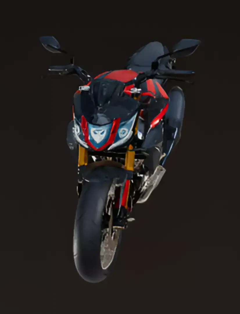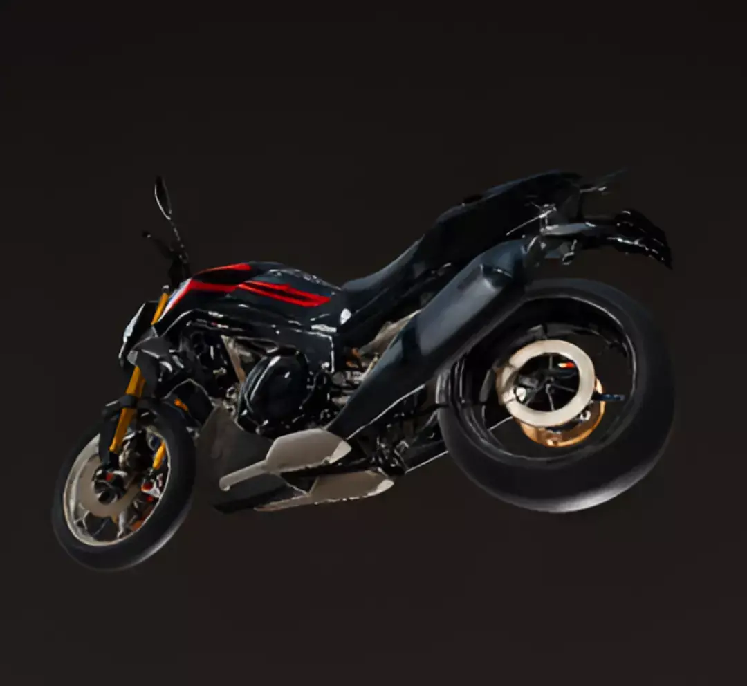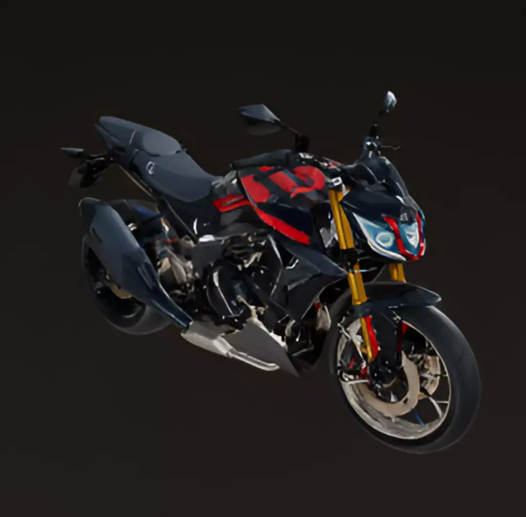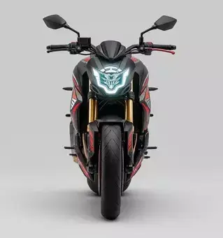A sleek, modern street motorcycle is shown from a front-quarter perspective in a clean studio setting. The bike's aggressive styling is a striking mix of matte black and sharp red accents, with bold graphics on the fuel tank and fairings. It features a futuristic front headlight with a bright LED signature, upside-down gold forks, and black alloy wheels with a red pinstripe. The prominent exhaust pipe on the right side and the exposed frame highlight the bike's high-performance nature. The overall design suggests a powerful and sporty two-wheeler built for both aesthetics and performance.
