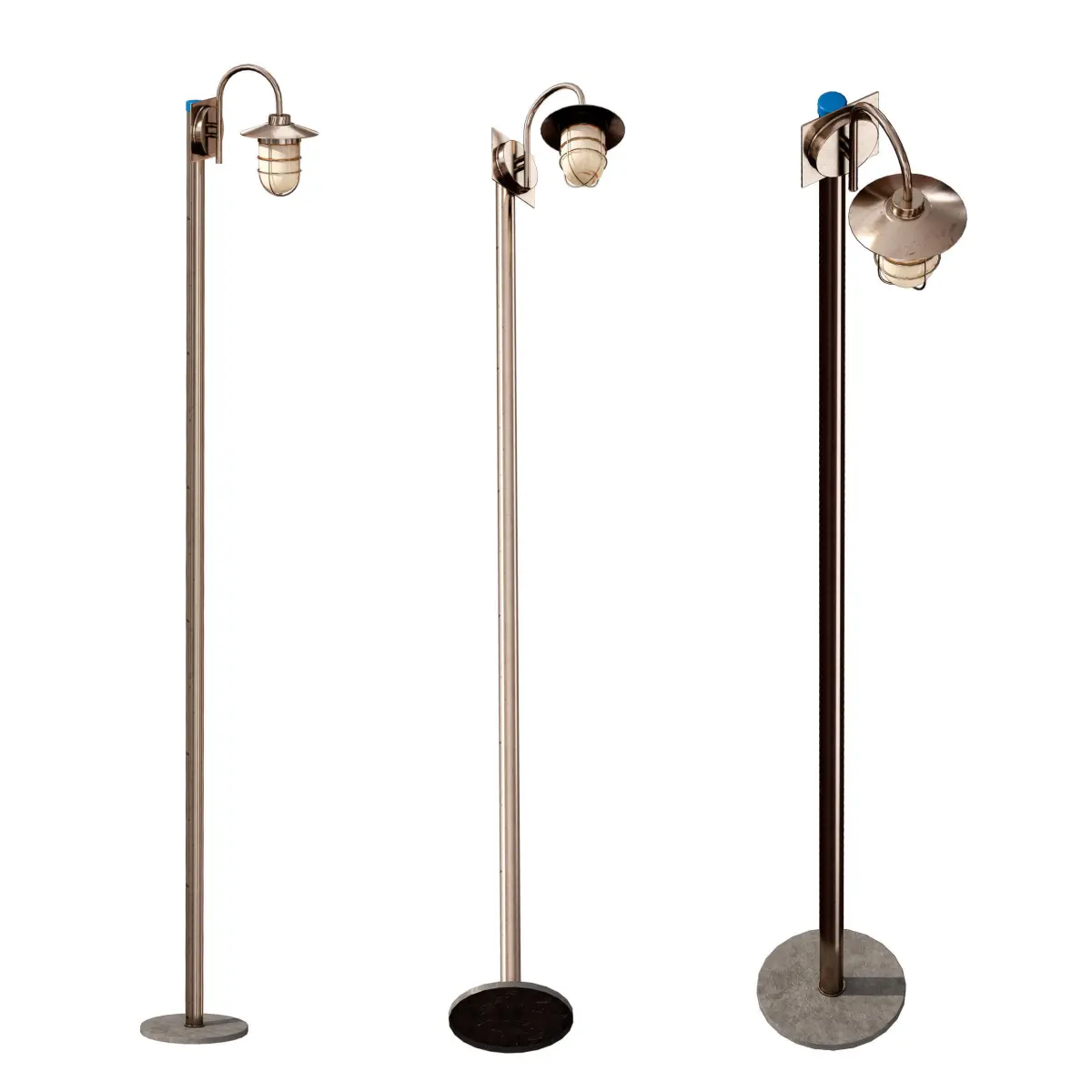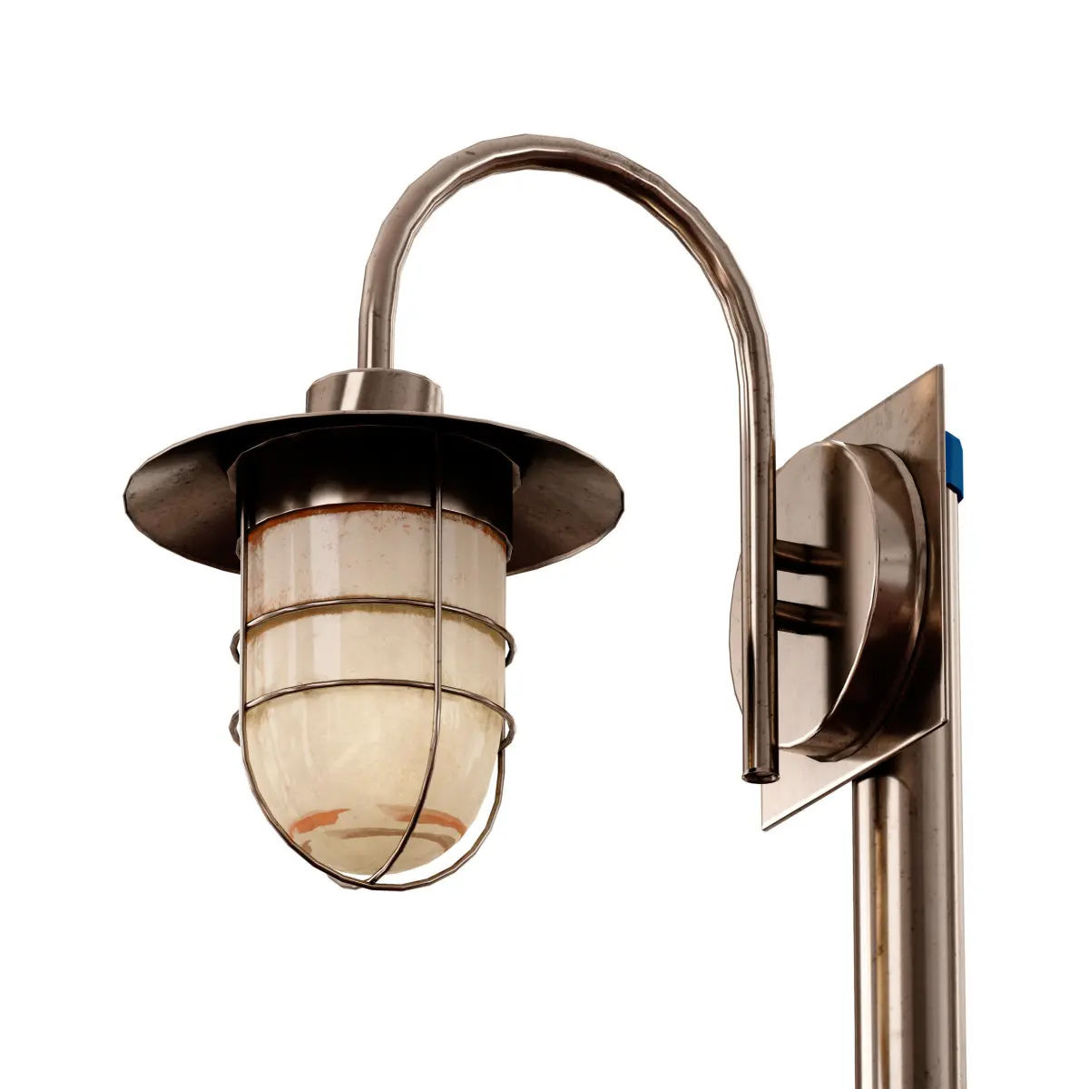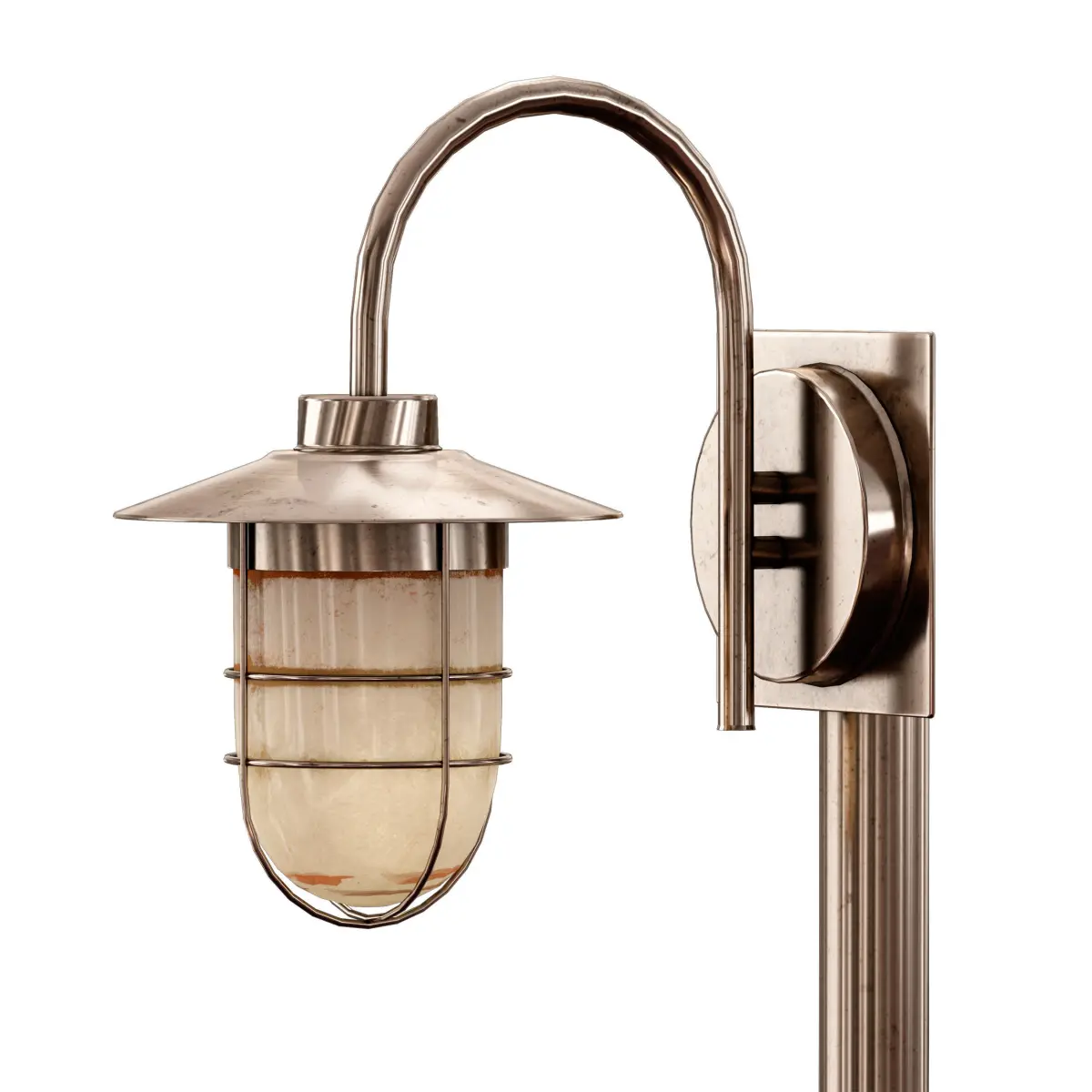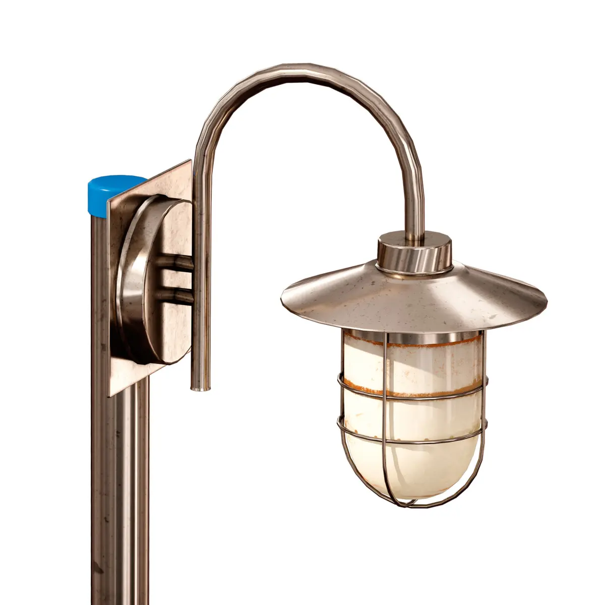 Street park lamp. Made of shiny brass-coloured metal. The metal pole is mounted on a concrete base. At the top there is a plafond on a curved surfacing, protected by a top cover and a wire frame. The materials and textures of the lantern are made with noticeable wear and dirt to give realism.