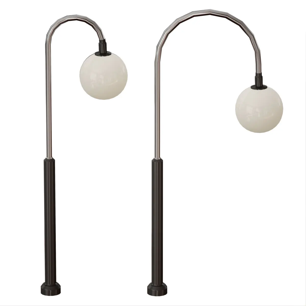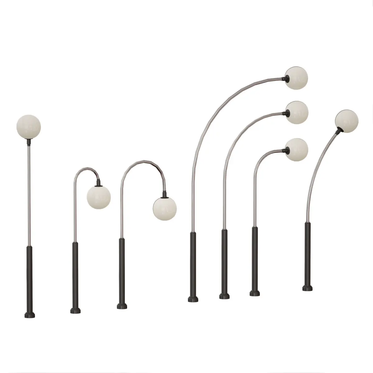 A set of outdoor park lights in a modern minimalist style in several modifications, including curved ones. Metal cylindrical base - pillar, with a spherical glass shade. The model is presented in four different materials (all black, all grey, black with chrome and gray with chrome).