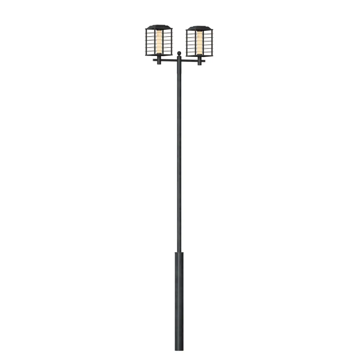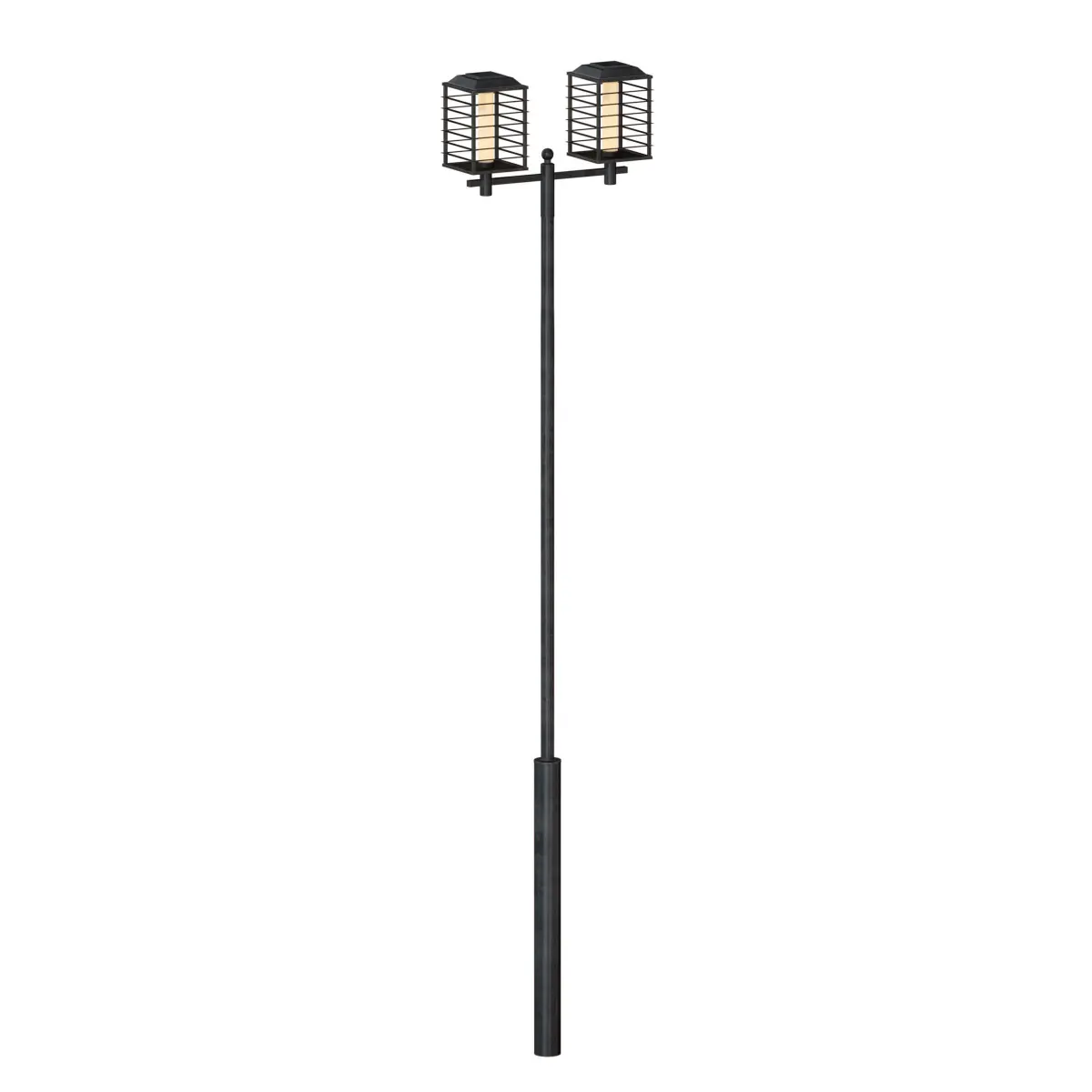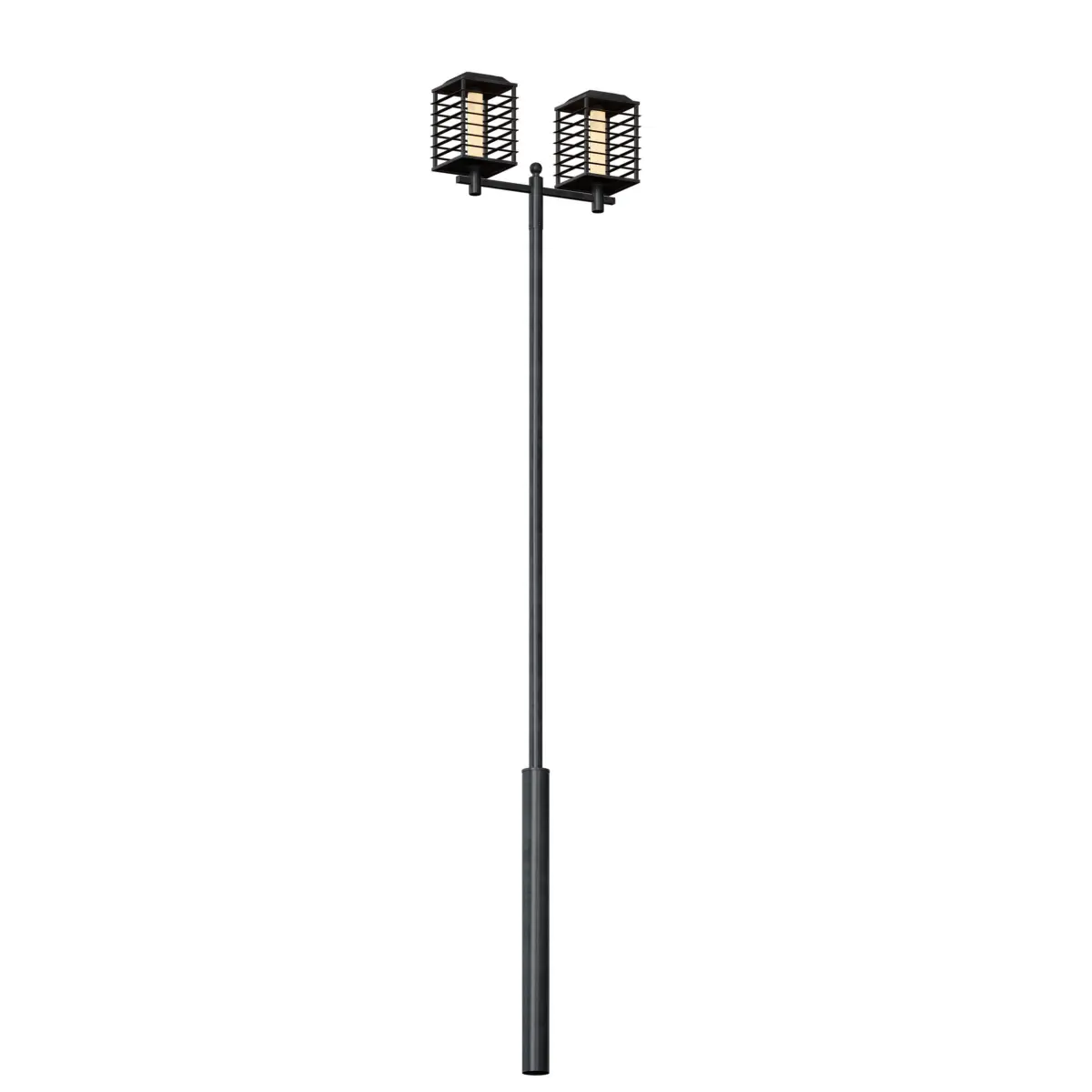 3d model of a metal street, park lamppost. The pole is made of painted metal, on the pole there are two rectangular lanterns with a protective grille.