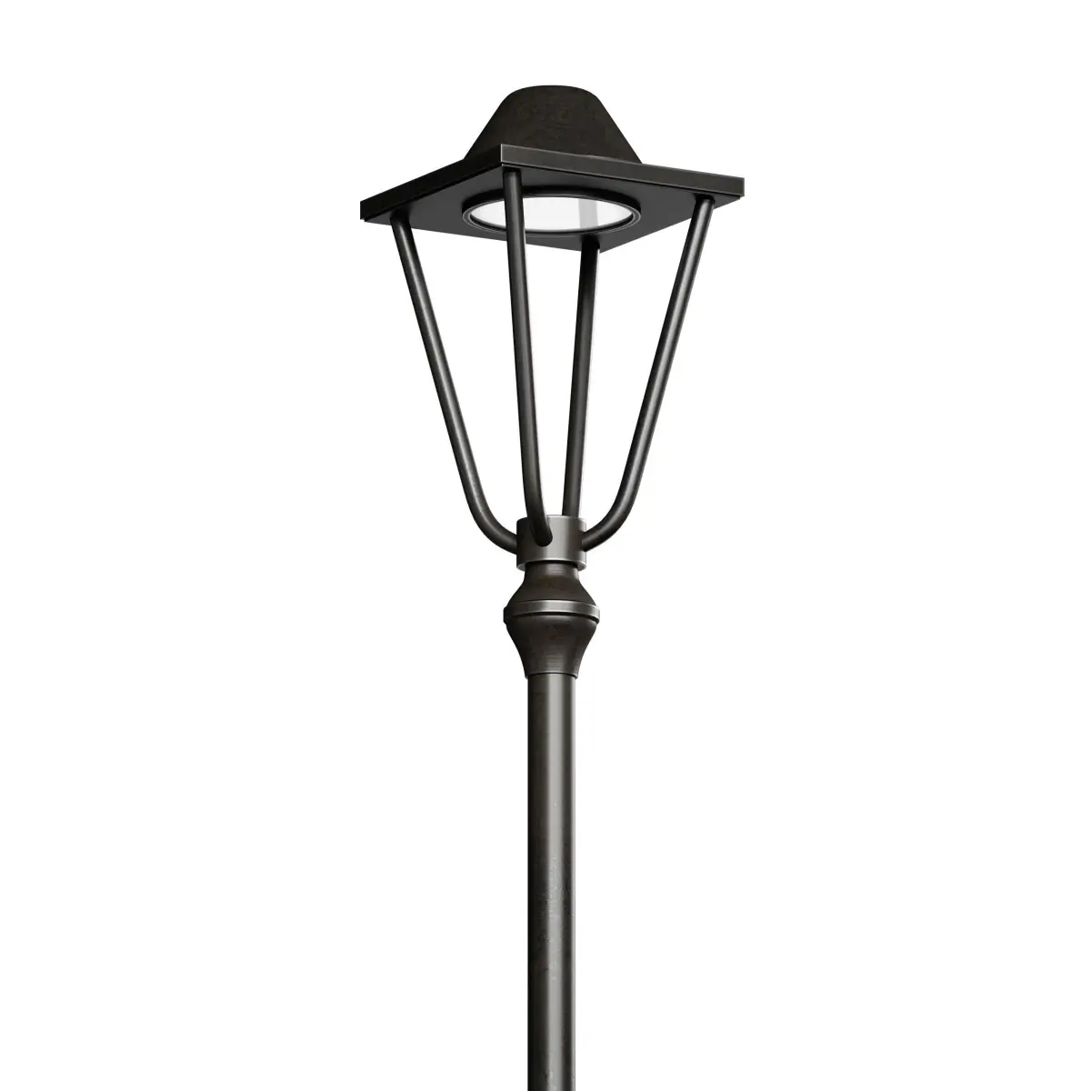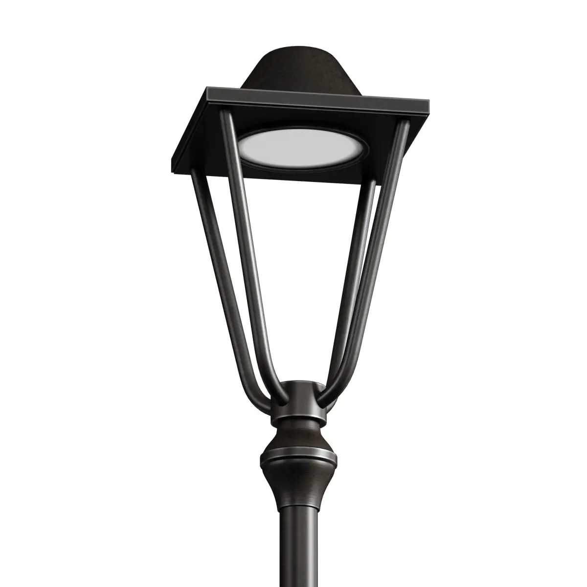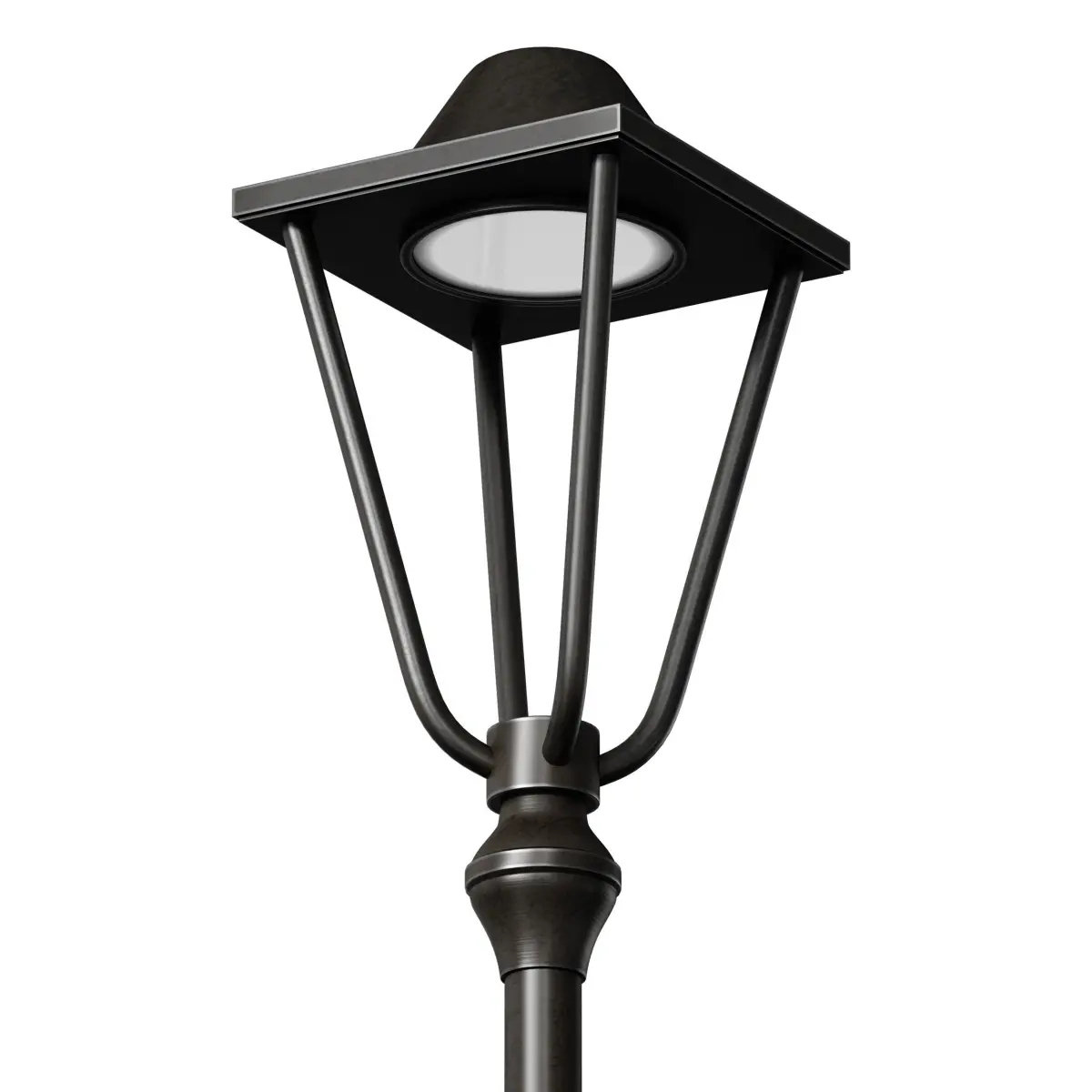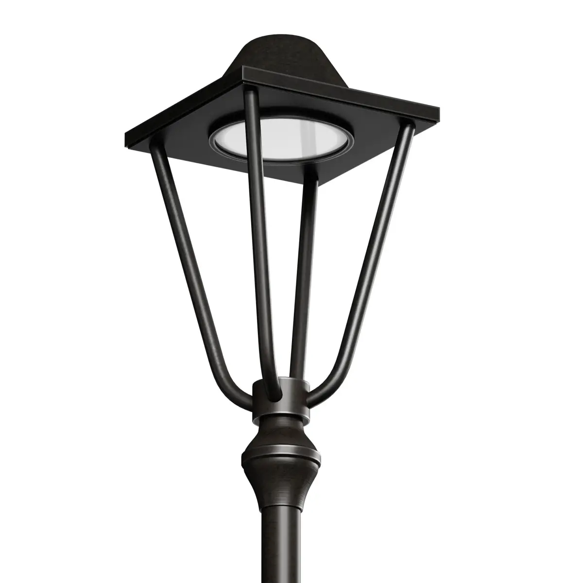 3D model of a street park lamp, a lamppost made with elements of a classic style. The post is made of metal, the color is black or dark brown. The model is made for smoothing.