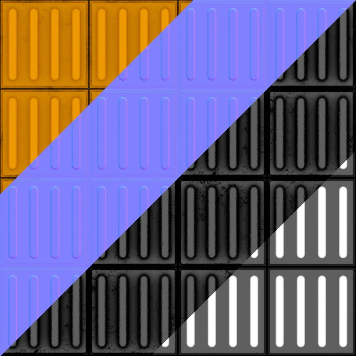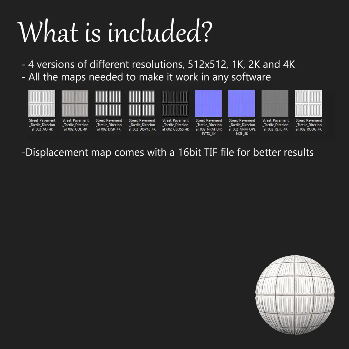 All the maps are 8bit except displacement, where you get a 16bit TIF fileThis material is a tactile floor, which is used to guide blind people through spaces. It's commonly found in Subway stations, public buildings and streets.