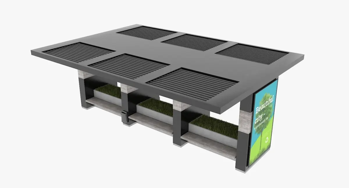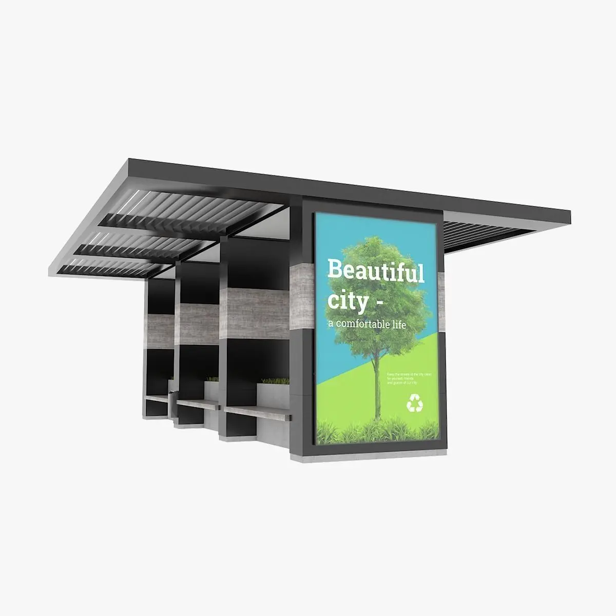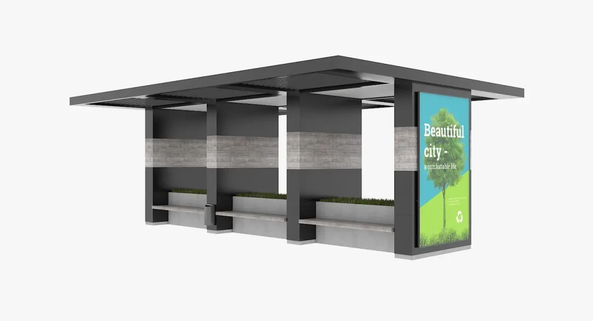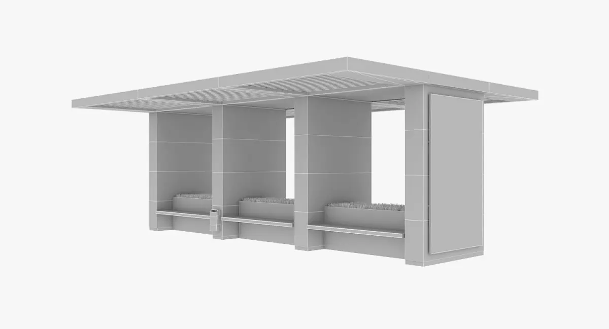 Steel frame, lined with black metal sheets. Three niches with benches and flower beds. Two urns for smoking. Advertising box with a banner under the protective glass. Three built-in light boxes of frosted fiberglass. By default, the scene is enabled.