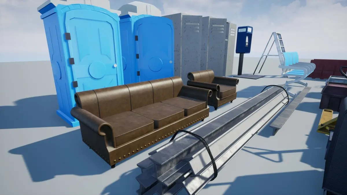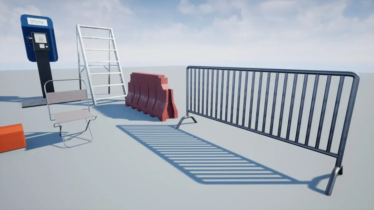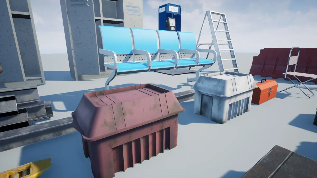 The Product Containssofa,Tin,Toolbox,Paintbox,VLC,Median,Divider,Ladder,Trolly,Restroom,Chair,Suitcase,Fence,Travelbag Etc,All Model is UV Unwrapped and texturedAll models are Game-Ready PropsModels contain 2K Textures