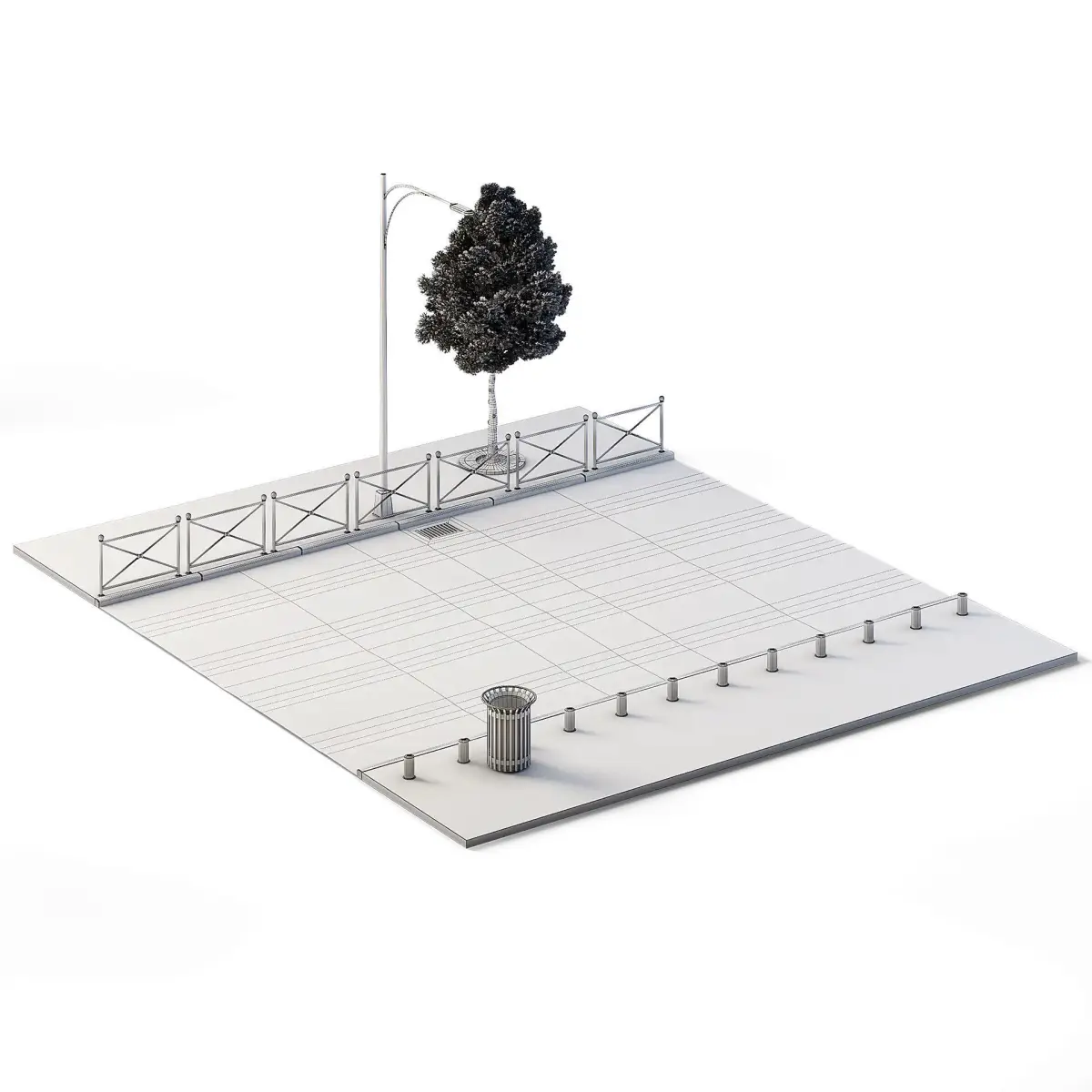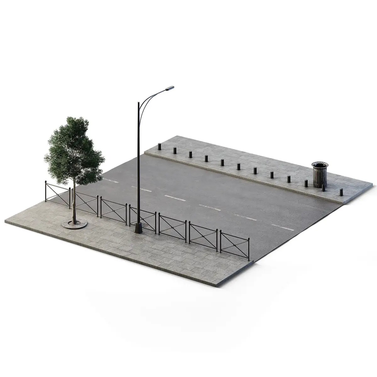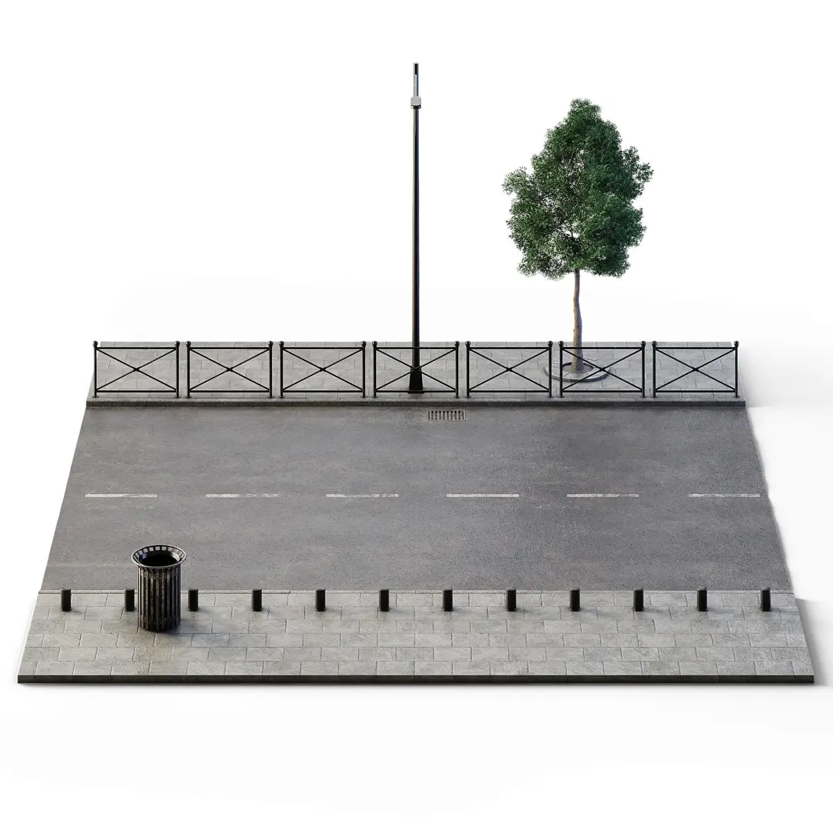 Two way street set. Contains elements such as: tall street lamp, sidewalk barrier, small leaved lime tree, small sidewalk pole and street trash bin. Dimensions: 12m x 14m.