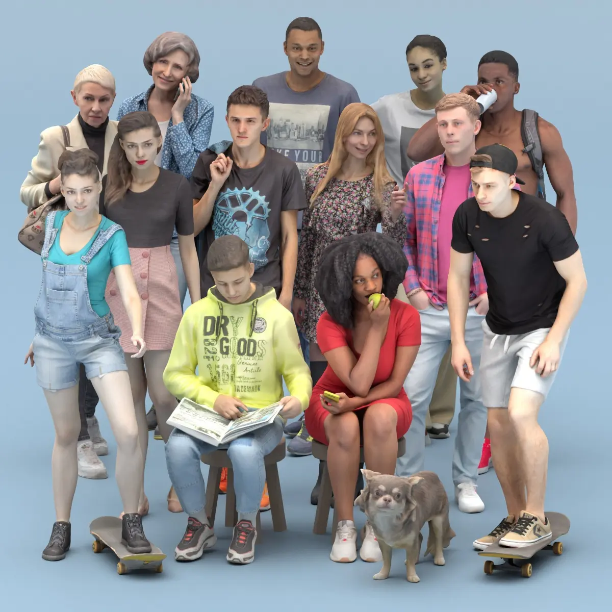In this bundle, you will discover a diverse array of casual individuals, along with one charming dog companion. The collection includes sporty men and attractive women dressed in casual, everyday attire. These models are captured in relaxed poses, making them a perfect fit for various architectural visualizations, background characters, product visualizations (e.g., parks, streets, cafes, beaches, gardens, urban scenes, VR/AR content, interior scenes, advertisements, and more).