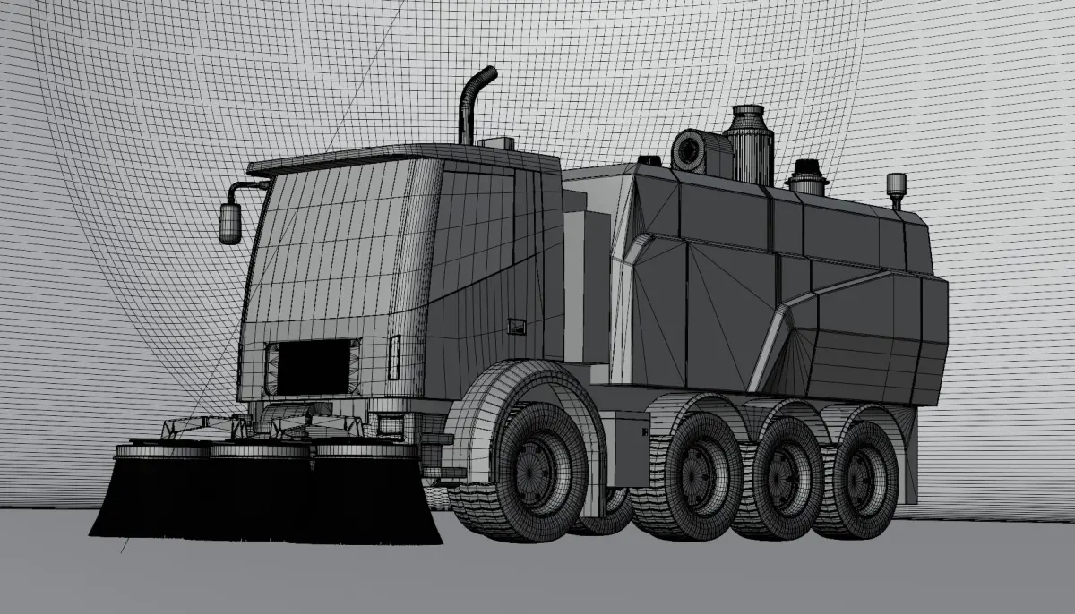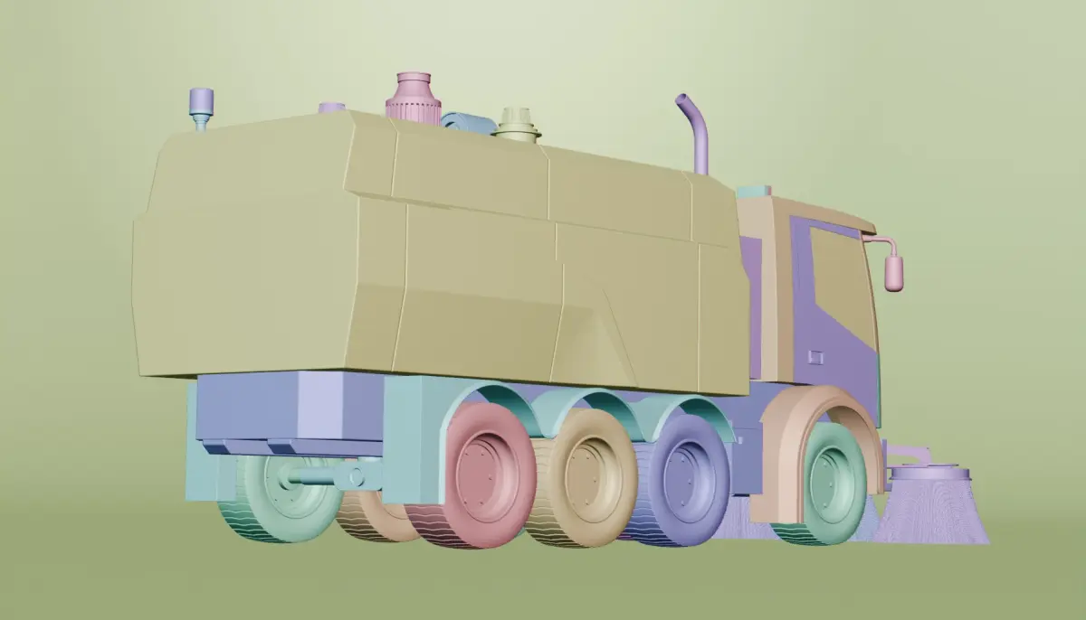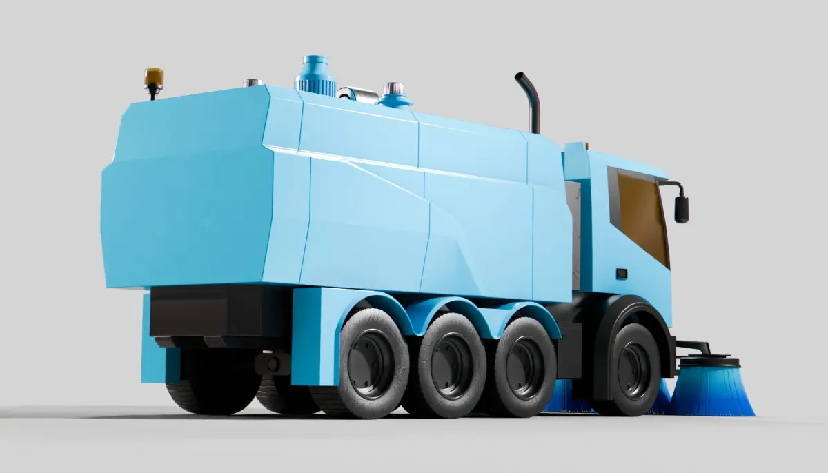 A sleek street sweeper with a vibrant blue color, equipped with rotating brushes and a powerful vacuum system to efficiently clean the city streets, designed for modern urban environments.All textures are 4k PBR.