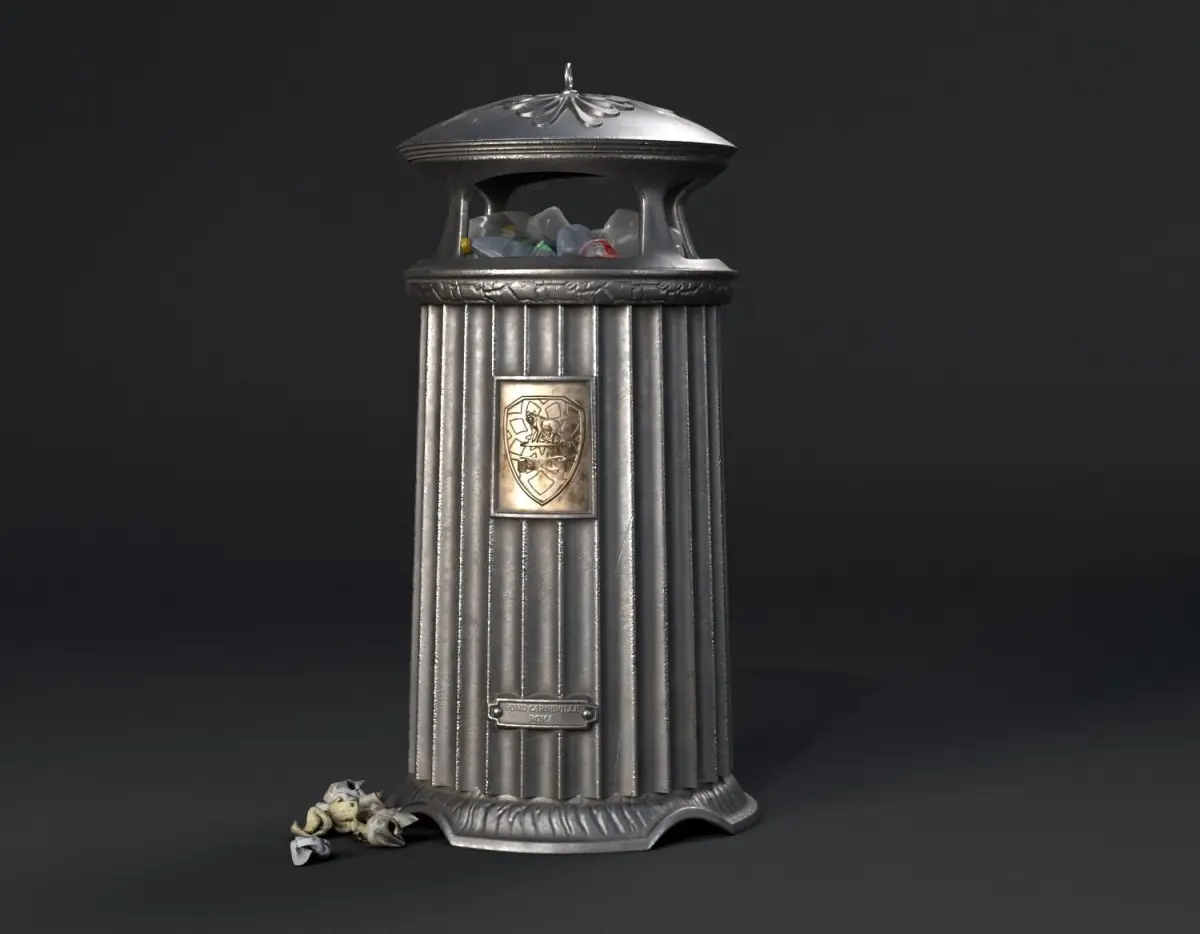 The scene consists of 3 texture sets: 4096x4096 for the trash can, 1024x1024(2) for crumpled paper and smashed bottles.