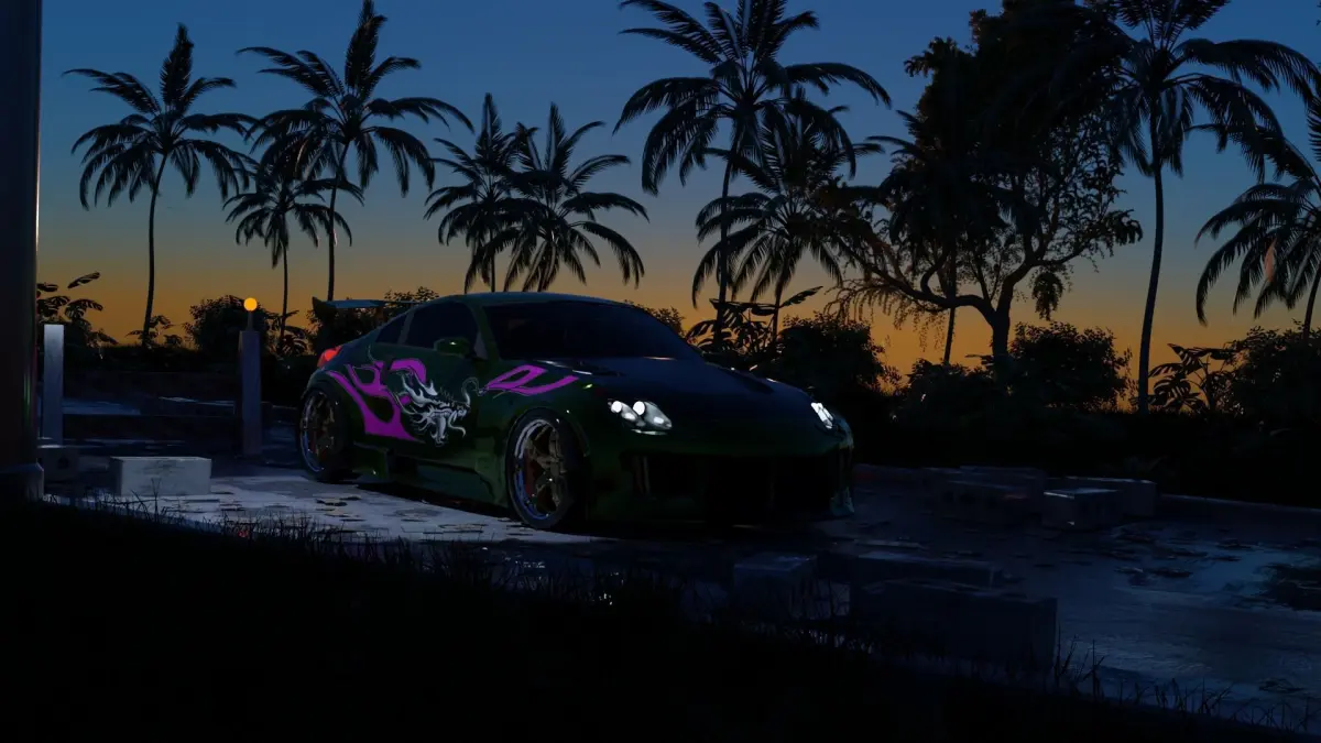 3d scene of a road in a tropical area with palm trees and other plants, well detailed road with stones, paper, leaves and puddles on it, also added Rachel 350Z car from NFS underground 2. Well detailed model of the car and the whole scene, adjusted materials and lighting , the final file is missing car textures and some plant and palm textures, they were lost, all other textures are present in the zip archive. I hope you enjoy my work, good luck!