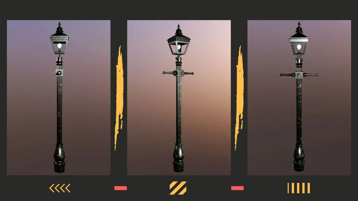 The default color of the lamps is green (worn), but you can choose to use any of the colors provided in the textures (green, blue, red, yellow, purple and black) and make them either pure color (good for a clean, modern and thriving city) or scratched/worn (perfect for something like a post-apocalyptic world).