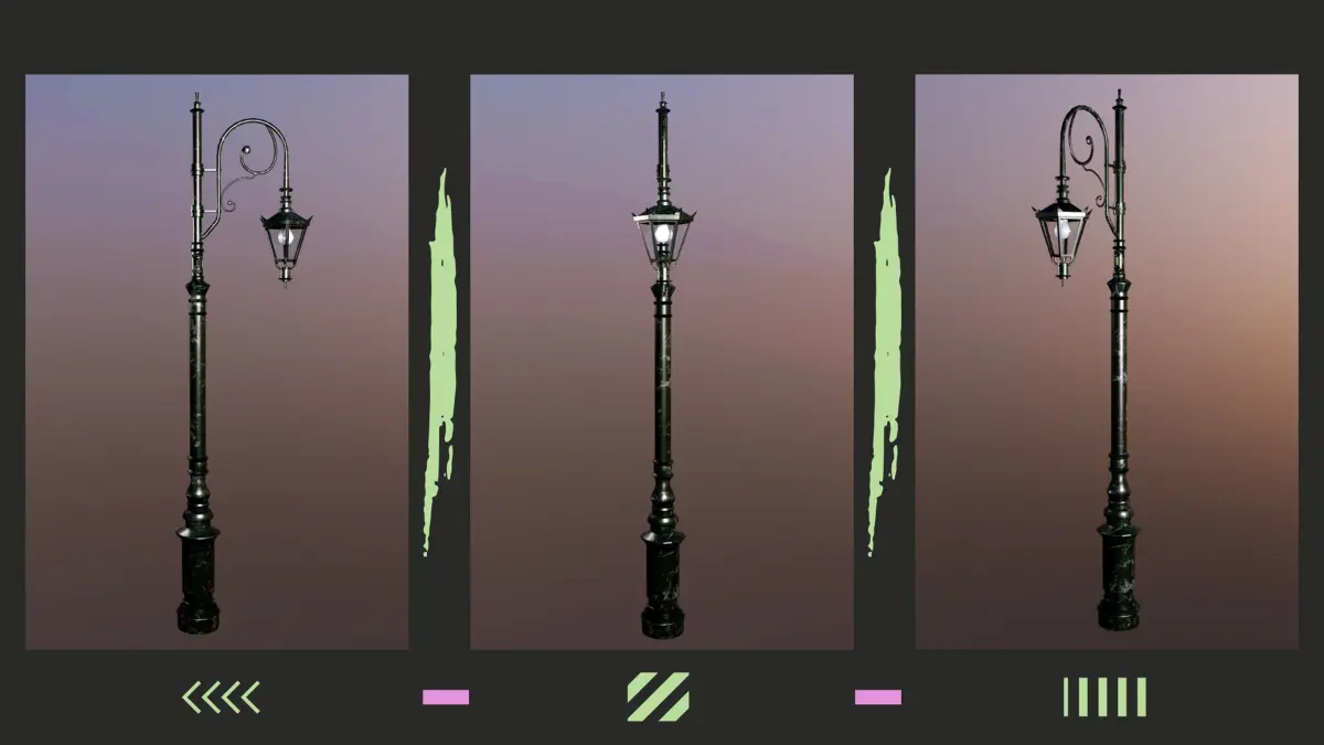 The default color of the lamps is green (worn), but you can choose to use any of the colors provided in the textures (green, blue, red, yellow, purple and black) and make them either pure color (good for a clean, modern and thriving city) or scratched/worn (perfect for something like a post-apocalyptic world).