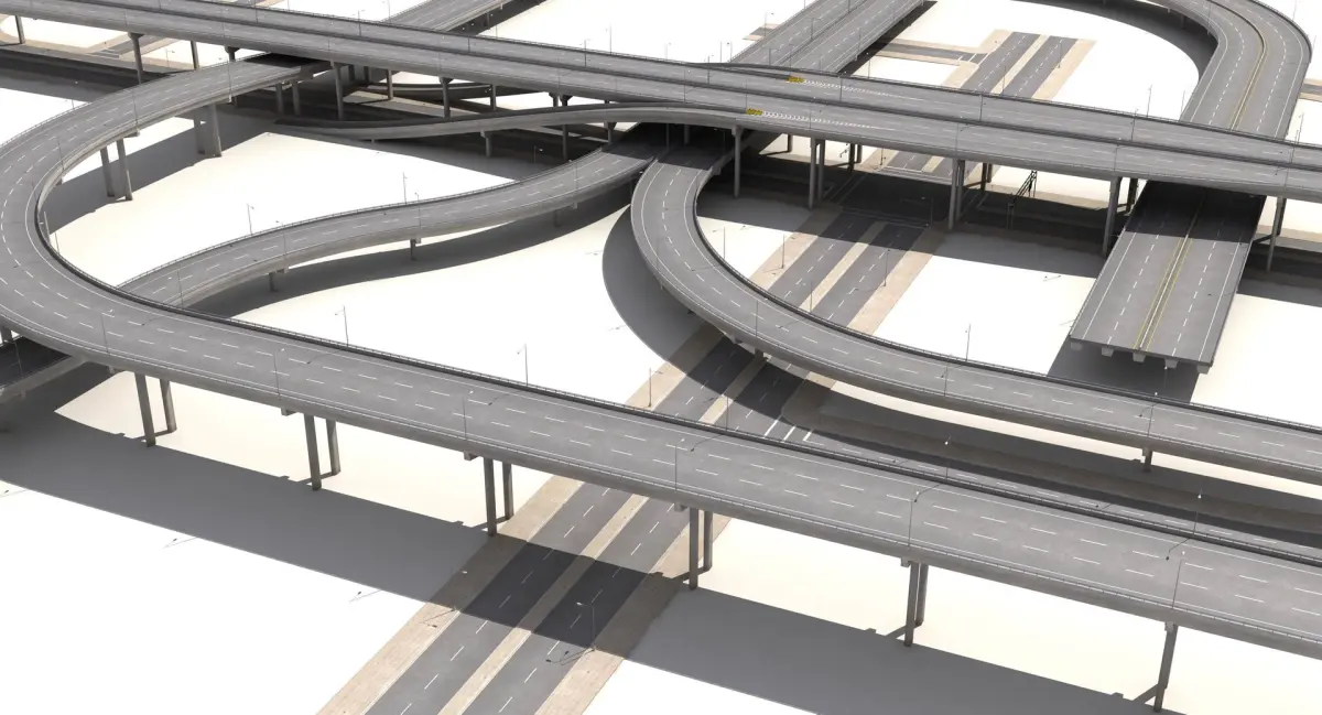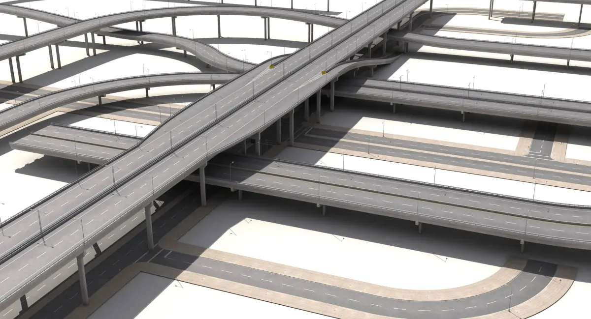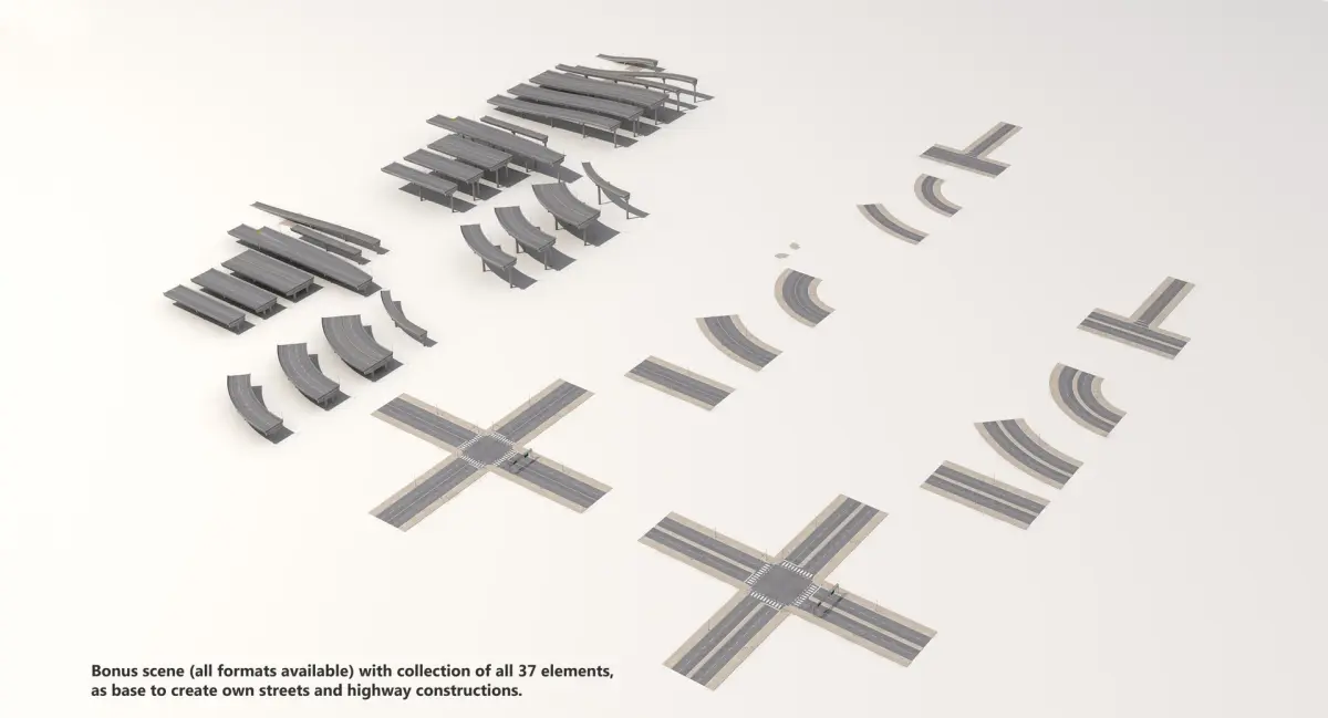 This is very accurate complete scene of highway with streets. Good mesh topology, very high resolution of road textures, detailed kerbs. There is also bonus scene with all elements separated, as base to create own roads construction (please check preview images).
