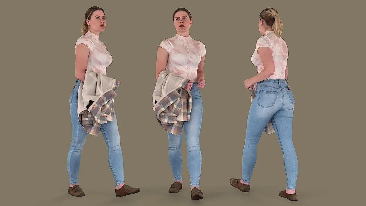 A young woman caught in the middle of a stride. She is stylishly casual, dressed in figure-hugging light blue skinny jeans and a form-fitting t-shirt that looks more like a body suit due to its snug fit and high neckline. It's a soft pink with a tie-dye pattern. A checkered shirt is casually draped over her arm, a playful nod to the grunge era. A smartphone peeks out from her back pocket, hinting at her digital connectivity. Her light hair is neatly tied up in a ponytail, keeping it off her face and allowing a clear view of her youthful features.