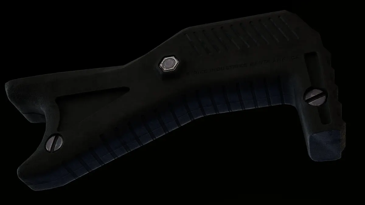 The Strike industries Cobra low profile grip made from Polimers with unique feature of “hood” that act as heat shield for your hand. Oh, and it have spiky front so you can bash people heads with it :]