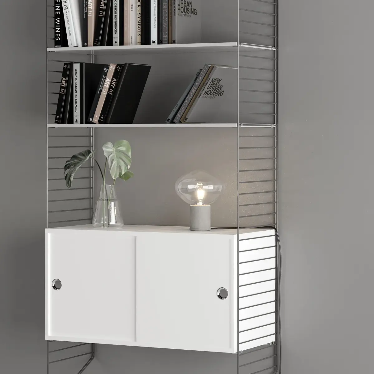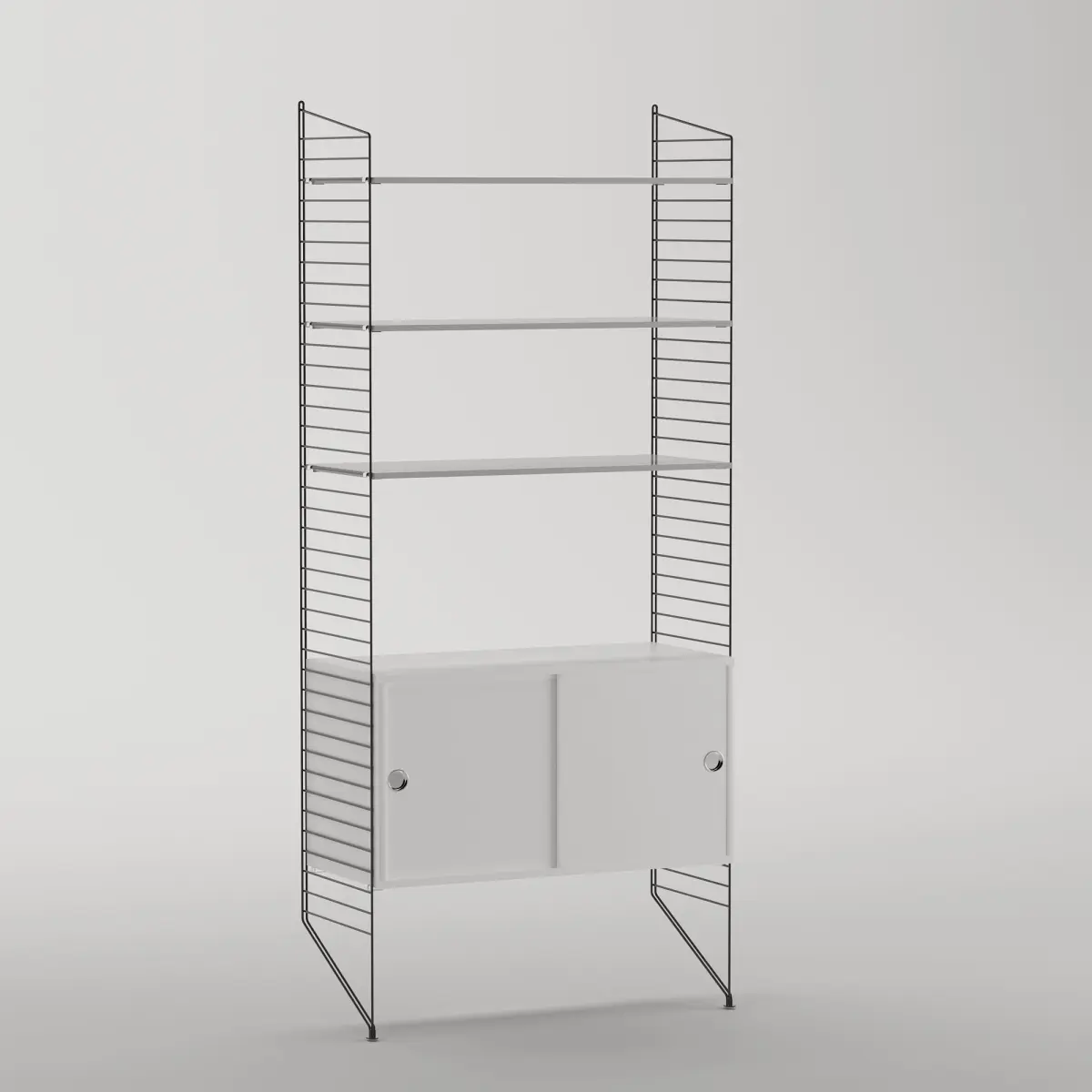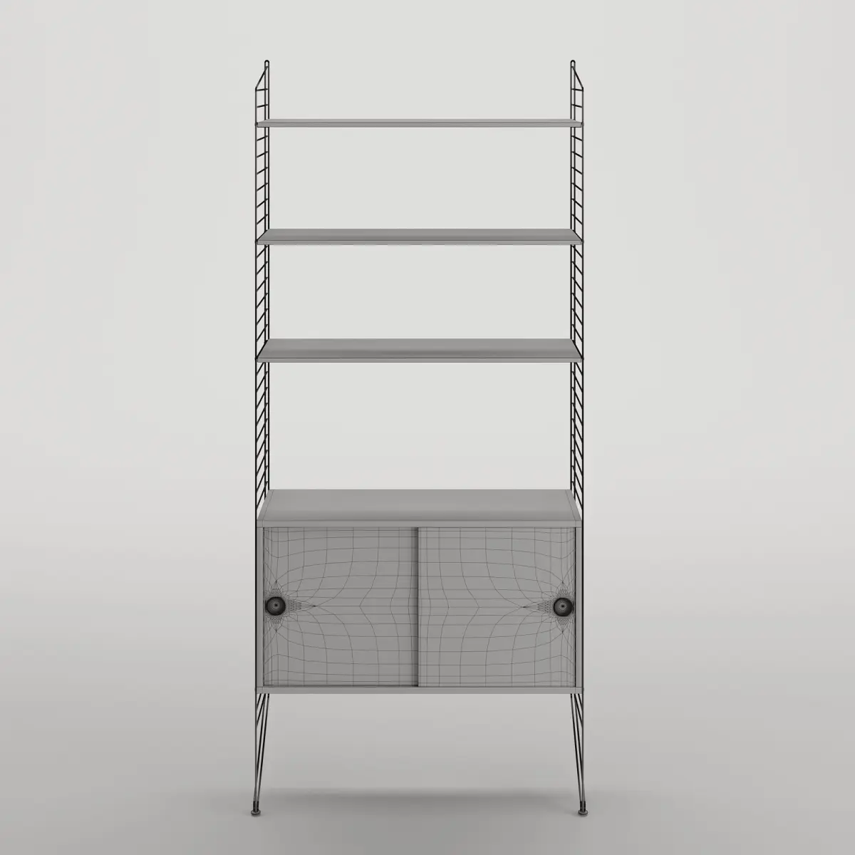 String shelf system with 2 sliding cabinet doors based on the design of Nils Strinning super flexible, distinctive andminimalist shelving system.OBS! the elements on this shelf system is not within this file (just for showcasing purposes).