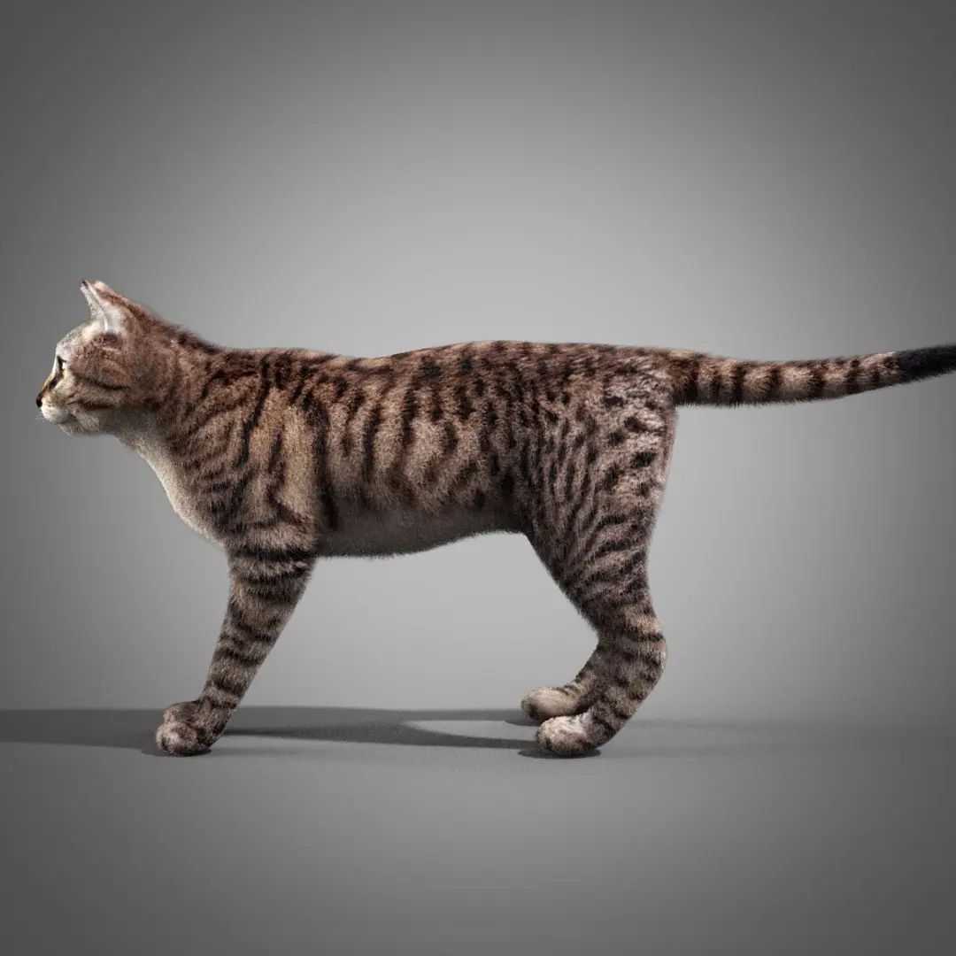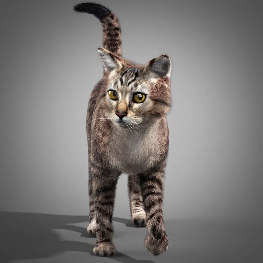 Grey cat 3d model. Morpher modifier. Hair and fur. Rigged. Vray render. This model contains only basic Biped Rig + Face Morph, no IK controllers.