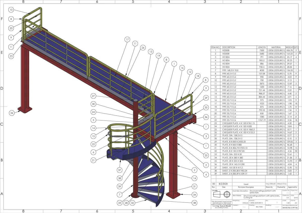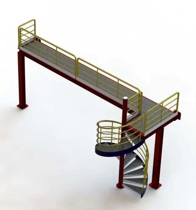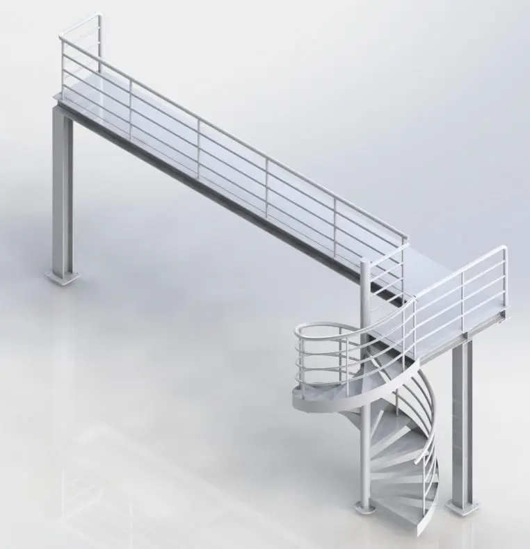 This is a steel structure of spiral stairs, all dimensions included, BoM and parts, I also upload SolidWorks files