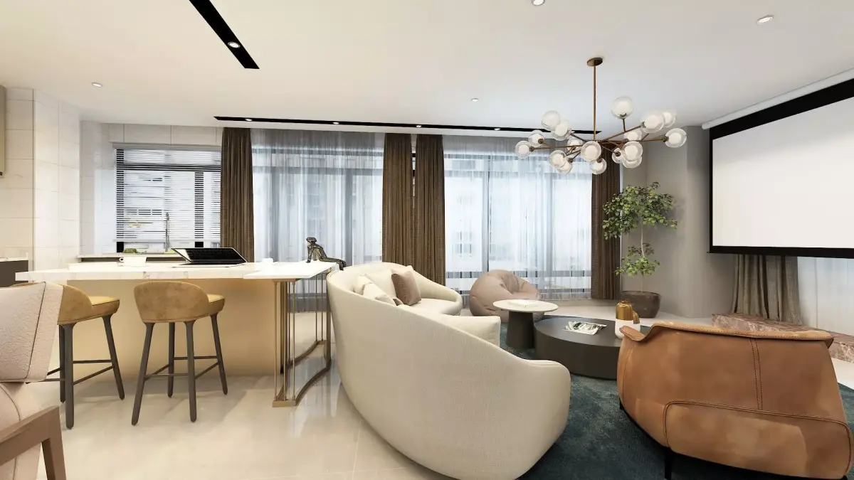 Completely furnished and decorated studio decorated with various items. Bathroom is considered in the layout, but not designed.
