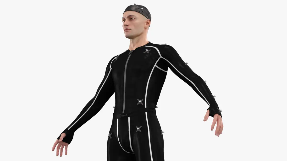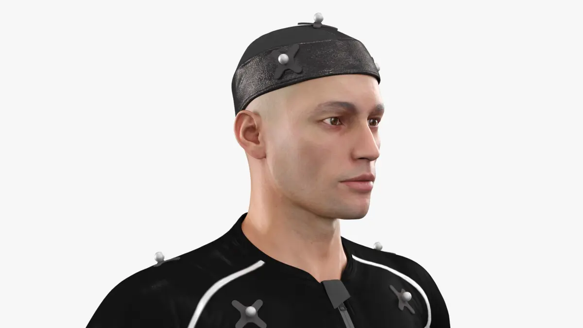Studio Mocap Suit on Male Actor Black is a three-dimensional model of a motion capture suit worn by a male actor, designed to capture physical movement data for digital animation and performance replication.