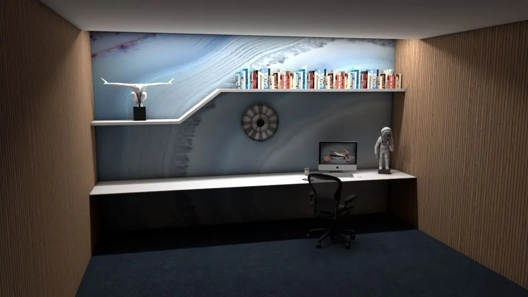 -wall covering material is indigo onyx and other wall coveing material is maple wooden stipes