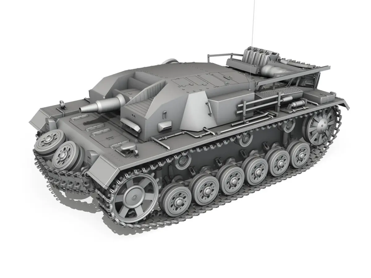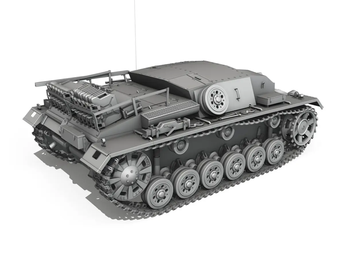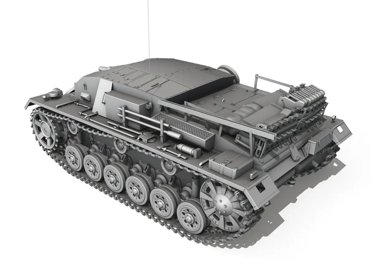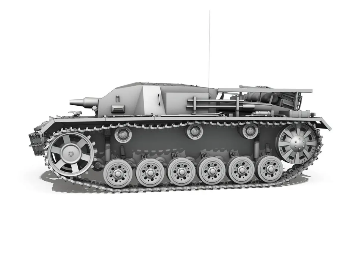 The Sturmgeschütz III (StuG III) assault gun was Germany‘s most produced armoured fighting vehicle during World War II. It was built on the chassis of the proben Panzer III tank. Initially intended as a mobile, armoured light gun for infantry support, the StuG was continually modified and was widely employed as a tank destroyer.