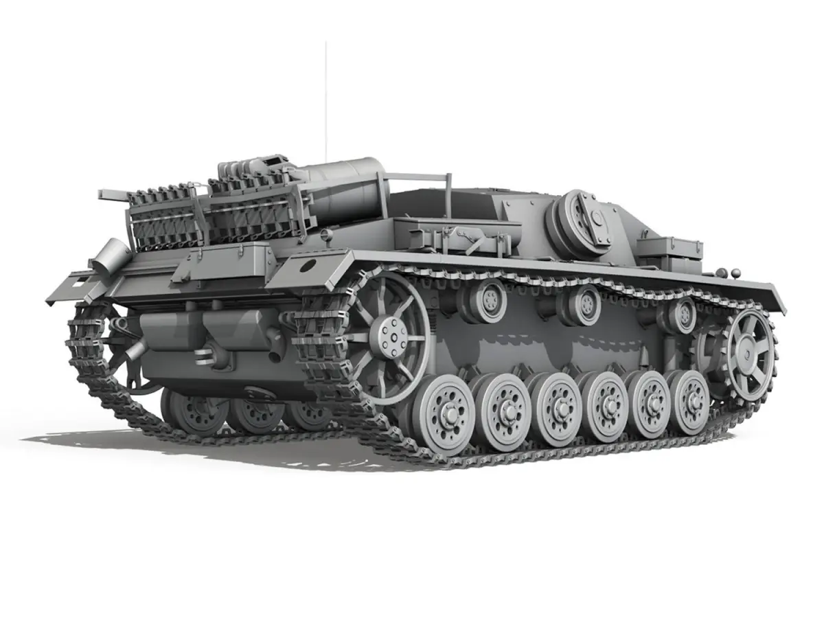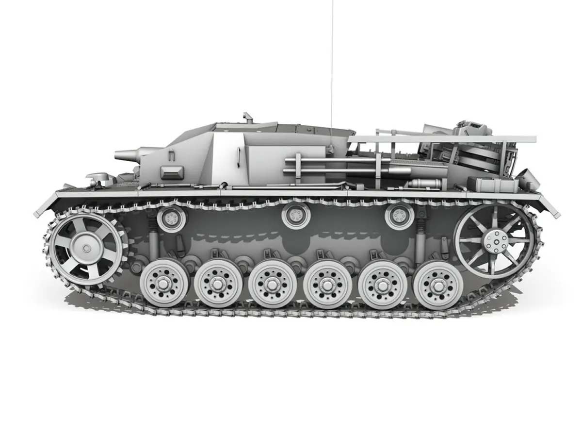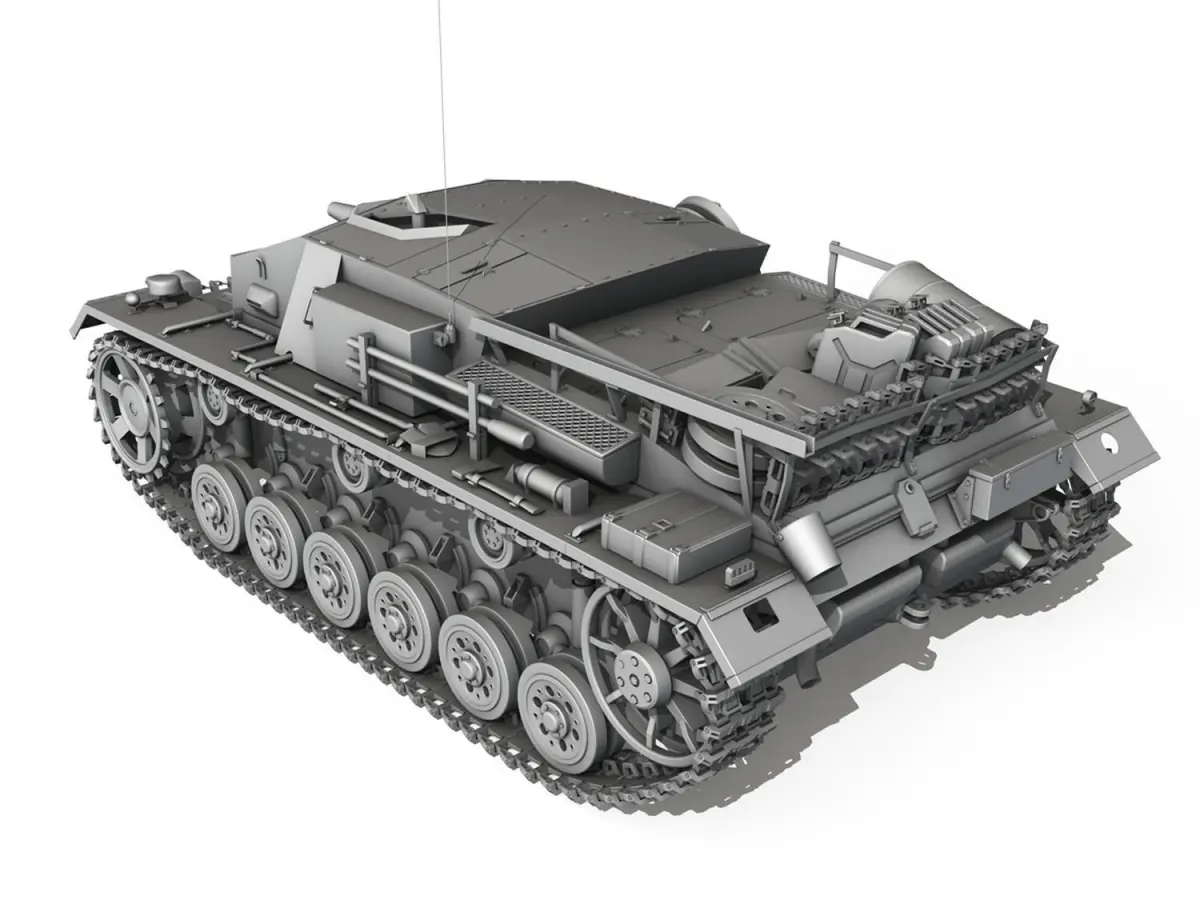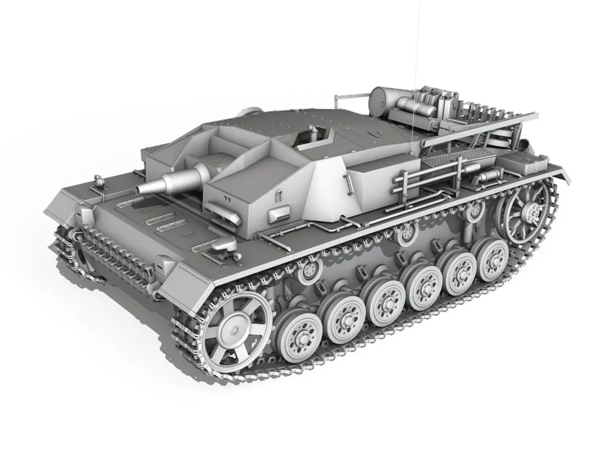 The Sturmgeschütz III (StuG III) assault gun was Germany‘s most produced armoured fighting vehicle during World War II. It was built on the chassis of the proben Panzer III tank. Initially intended as a mobile, armoured light gun for infantry support, the StuG was continually modified and was widely employed as a tank destroyer.