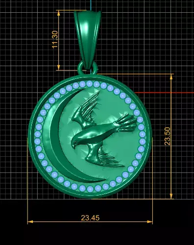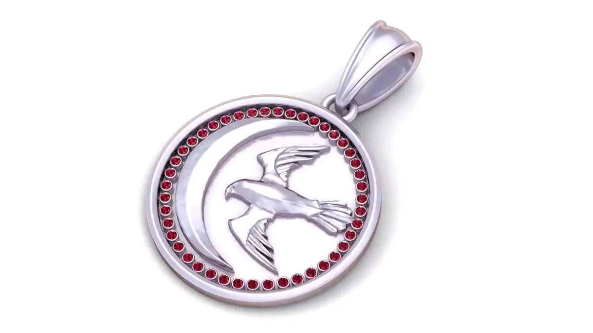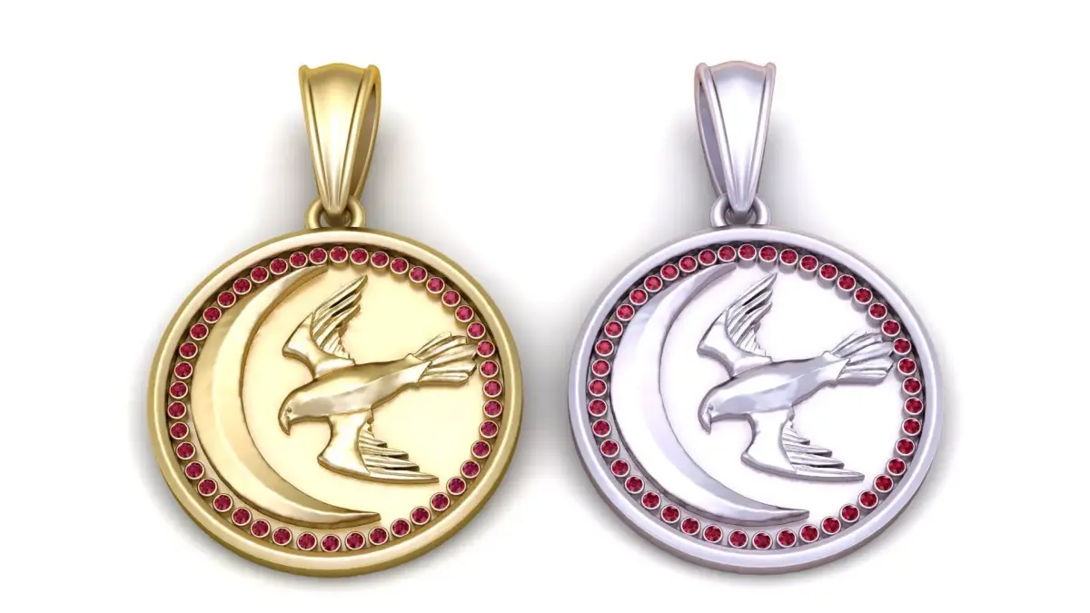 This stunning gold pendant features a beautifully detailed flying falcon set against a crescent moon, symbolizing strength, freedom, and vision. The circular design is framed with a brilliant border of sparkling red gemstones, adding a touch of luxury and elegance. Perfect as a statement piece or a meaningful gift, this pendant combines cultural symbolism with fine craftsmanship, making it a standout accessory for both everyday wear and special occasions.
