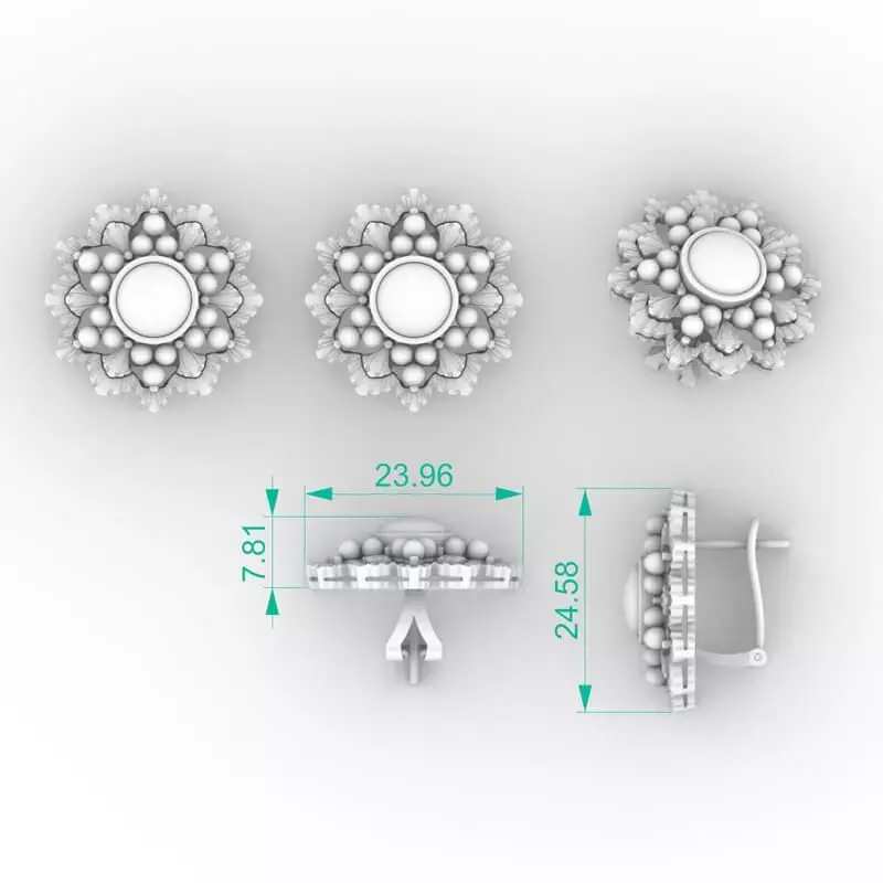 Diameter: 23.96mmThickness: 7.81mmTotal height with post: 24.58mmCentral pearl: 8.3mm semi-roundAccent pearls: 18 pieces of 2.5mm roundsJewelry modeling consumes precious weeks of your creative time. Complex floral designs require countless hours of meticulous work, delaying your production schedule and limiting your design capacity.