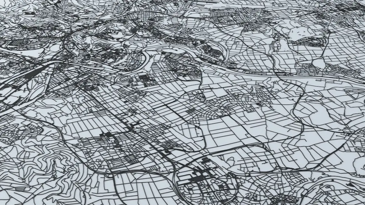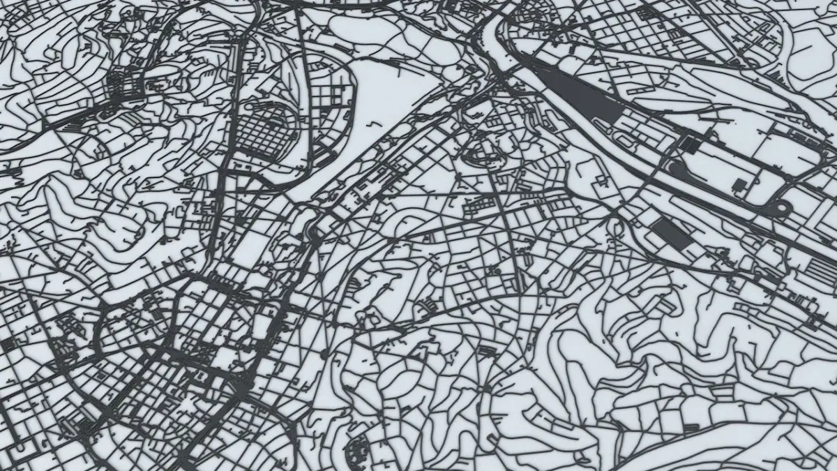 - the model is positioned on a flat surface (road network is on the “floor” - no elevation data included)