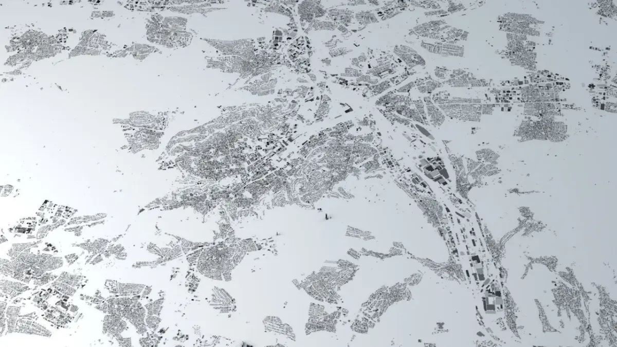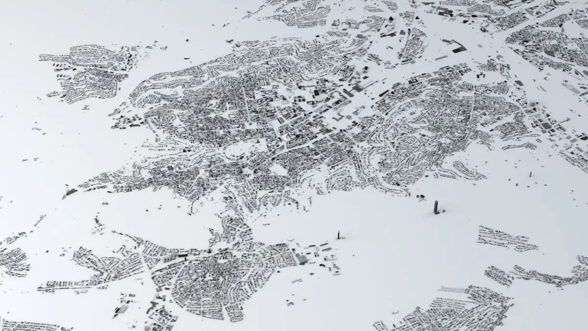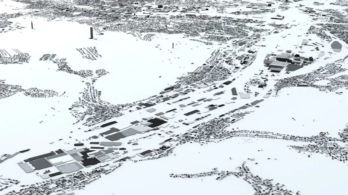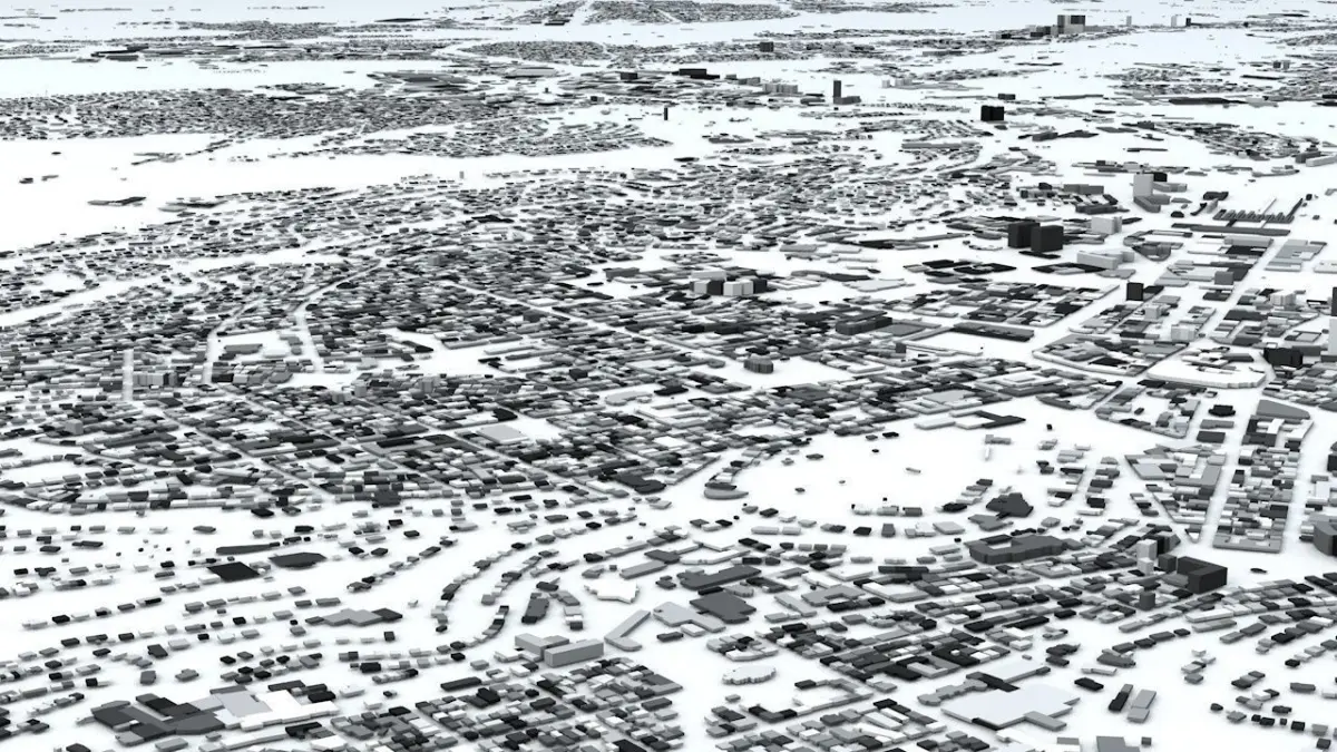 - the model is positioned on a flat surface (all buildings are on the “floor” - no elevation data included)