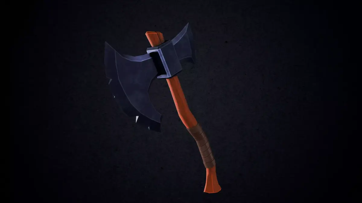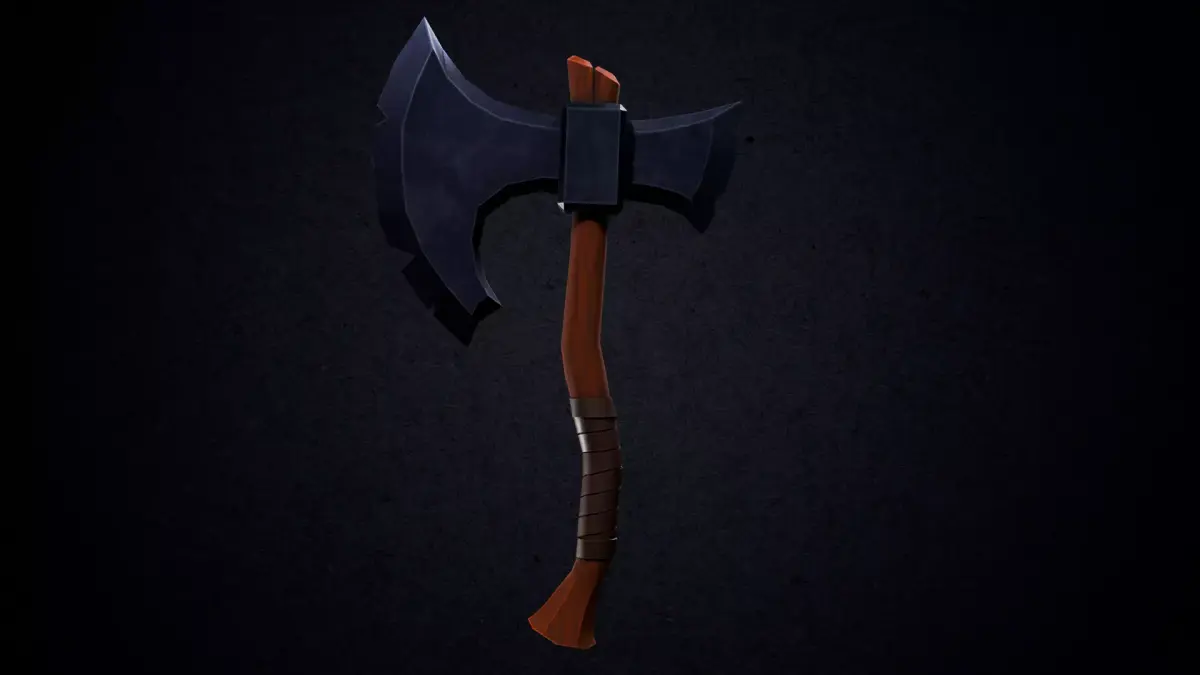A stylized double-bladed battle axe with a dark, rugged metal head with sharp, exaggerated edges for a bold, fantasy look. The handle is made of carved wood with a leather wrap for a balanced look of realism and stylization. This battle axe is perfect for games/animations, especially for a fantasy, RPG, or medieval scene with a touch of stylization.