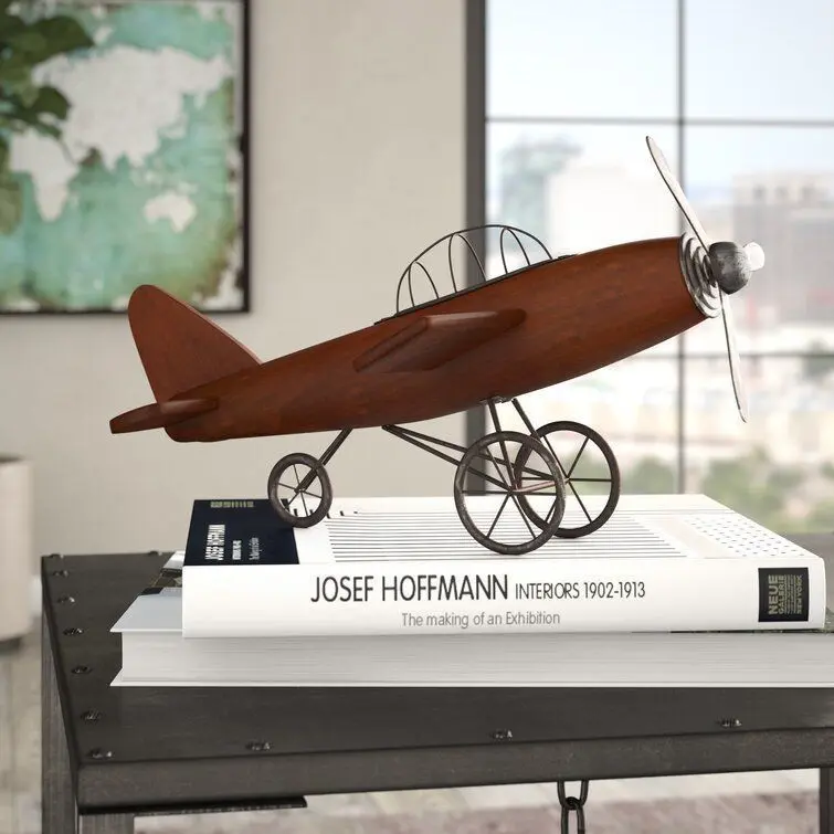- Be reminded of the early days of flight with this vintage style brown wood airplane sculpture in your classics inspired home. This fir wood constructed sculpture features an old propeller aircraft design in brown finish. The fuselage is crafted from the strong fir wood while the pilot roll cage, propeller, and wheel sets are made from iron. The overall aesthetic of this sculpture is distressed in nature, perfect for adding that vintage vibe in your home when displayed on shelves, desks, or tables. Get nostalgic with this vintage airplane miniature displayed on your console, coffee, or office table. Wipe clean with a dry cloth. Suitable for indoor use only. Vintage inspired. This item comes shipped in one carton.
