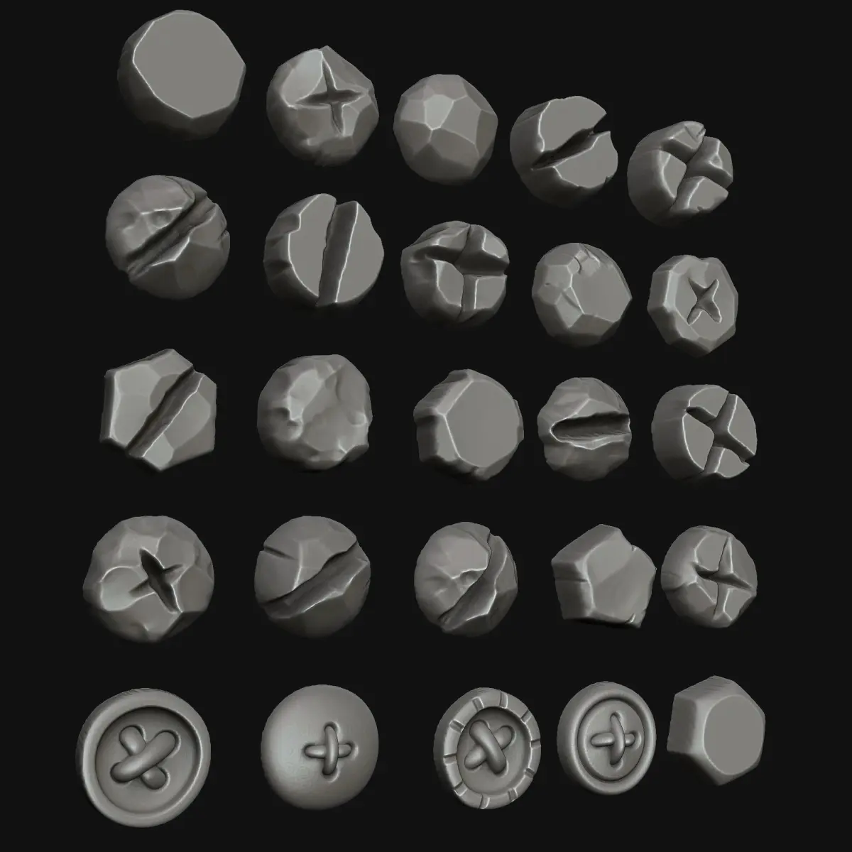 A set of Stylised 20 Bolts and 4 Buttons IMM & VDM Brush for Zbrush.