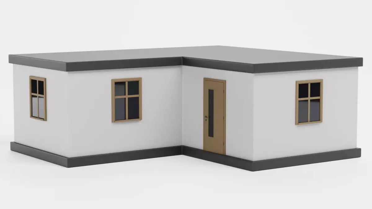 A stylised modern bungalow designed as a clean and efficient residential exterior. The L-shaped layout, flat roof, and contrasting façade create a contemporary house while maintaining a simplified, easy-to-use structure. Its optimized form makes it suitable for modern neighborhoods, architectural diagrams, infographics, and game environments.