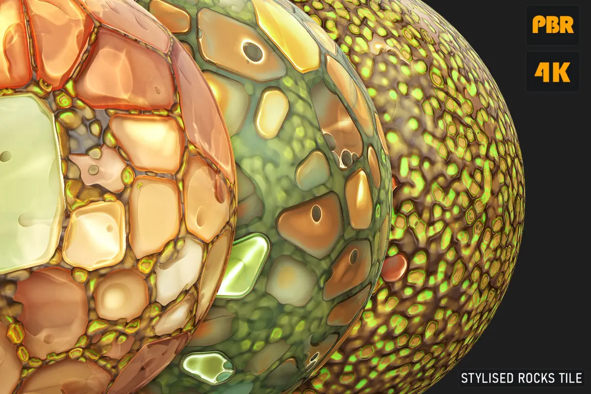 Thematic pack of stylised rocks tile materials with 4K textures, which includes five cards: