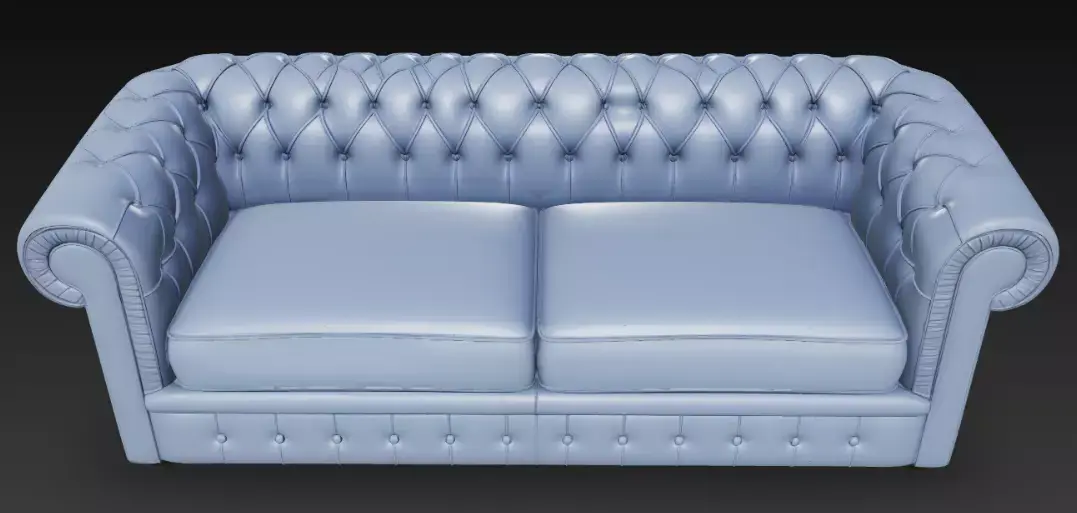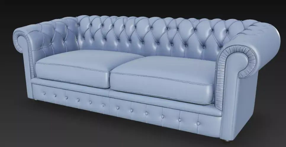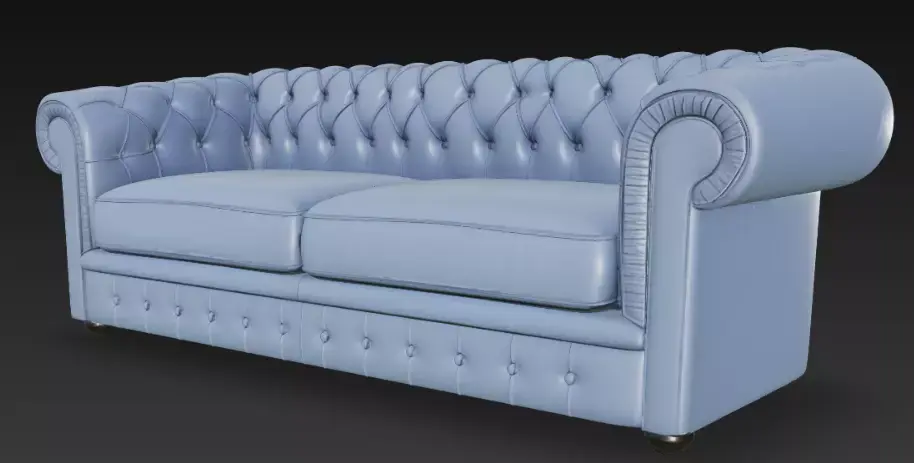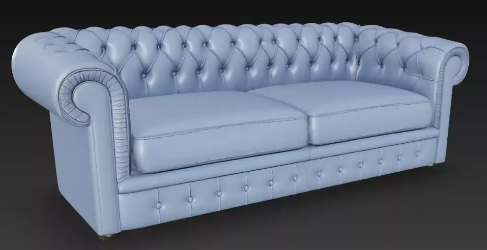 This 3D model showcases a stylish blue Chesterfield sofa with detailed tufting, rolled arms, and solid wooden legs, perfect for modern interior design projects. The model features smooth leather textures and a sophisticated design, ideal for virtual staging or upscale furniture visualization.