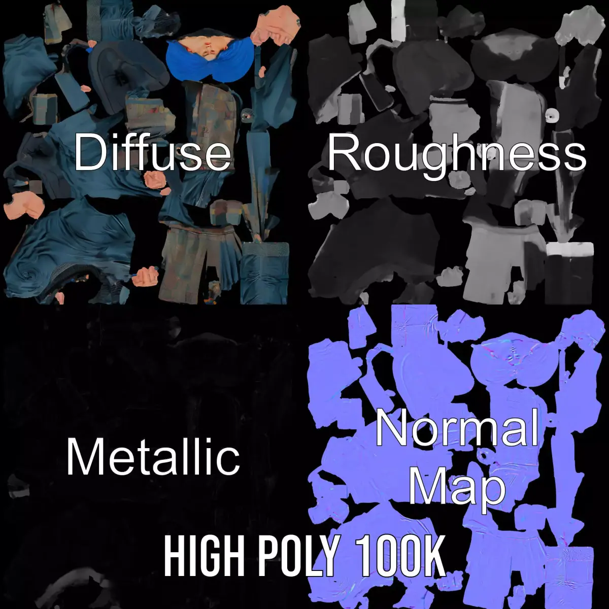 This stylish blue-haired character model features a dynamic pose and unique attire, making it perfect for games and animations. The model is suitable for fantasy, sci-fi, and contemporary settings, offering a versatile addition to your creative projects. Each model has 3 levels of detail: low-poly (1000 triangles for mobile), middle-poly (10,000 triangles for environment), and high-poly (100,000 triangles), which allows for use in production rendering (such as 3ds max, Maya, Cinema4d, Blender, Vray/Corona/Cycles and others), game engines (Unity and Unreal compatible), and interactive presentations, providing a choice of detail based on the LOD system principle. The model's textures are PBR, Diffuse, NormalMap, and reflection/roughness/metallic, which are suitable for any modern rendering engine. All models are accurately unwrapped with no overlapping UV. Textures are 4096*4096 in size. Please like and leave a comment if you enjoyed the model.