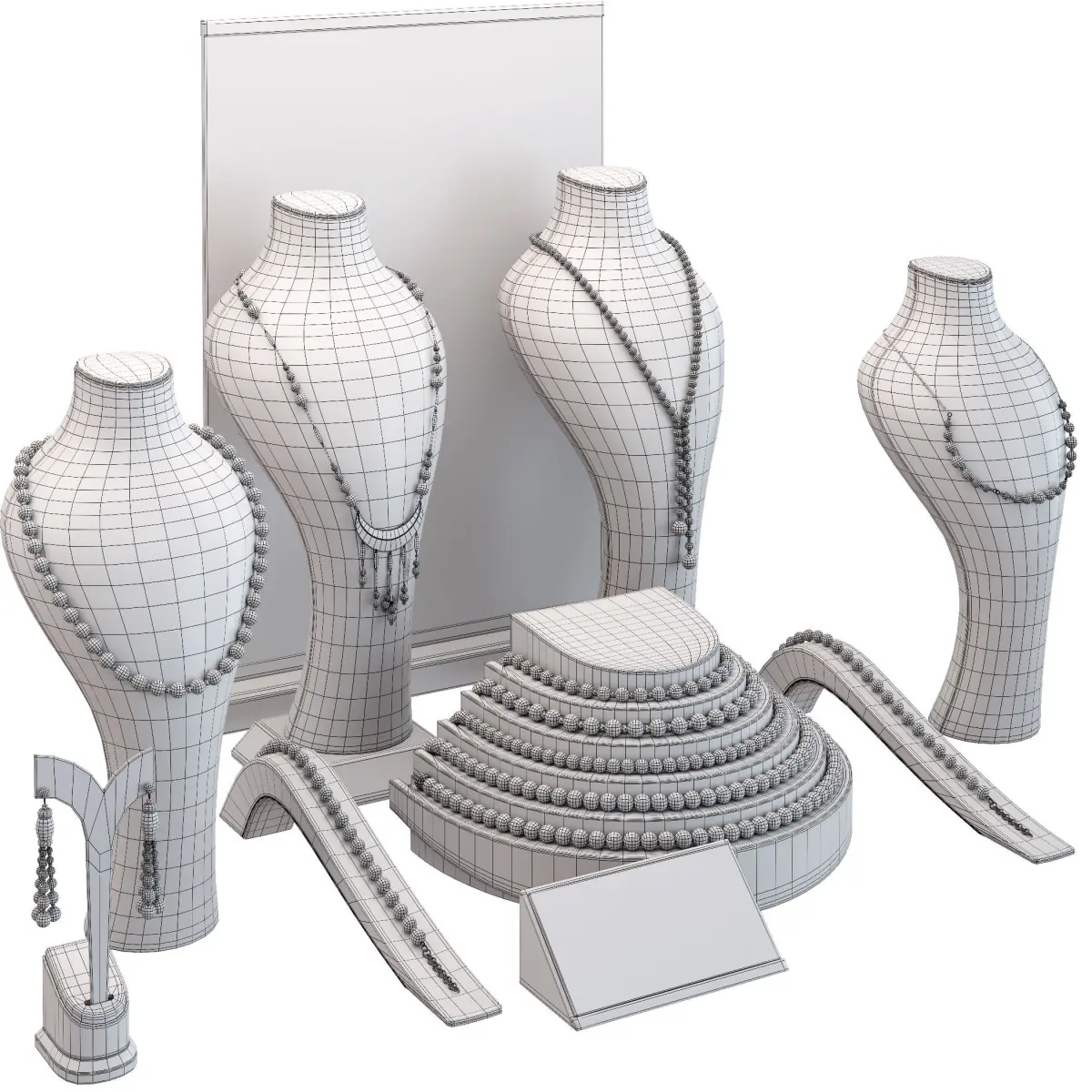 The showcase consists of five compositions with jewelry, with the possibility of using each one separately.