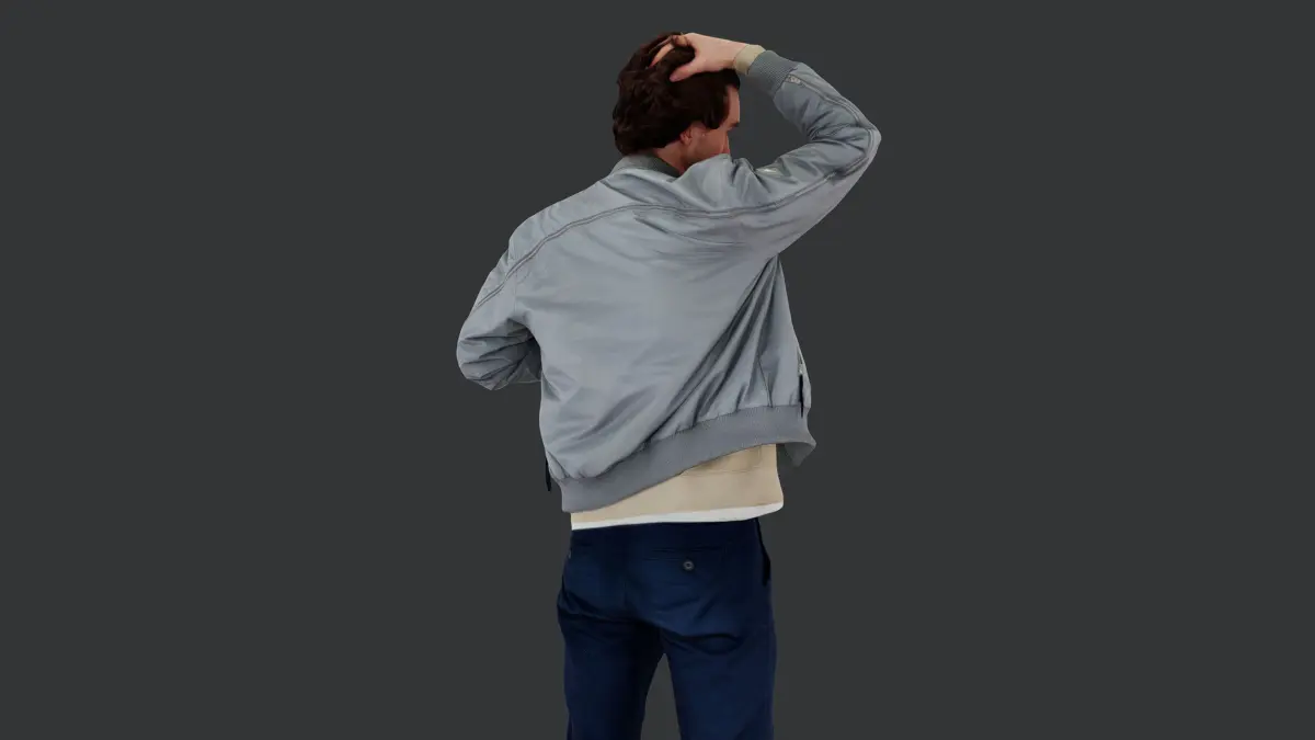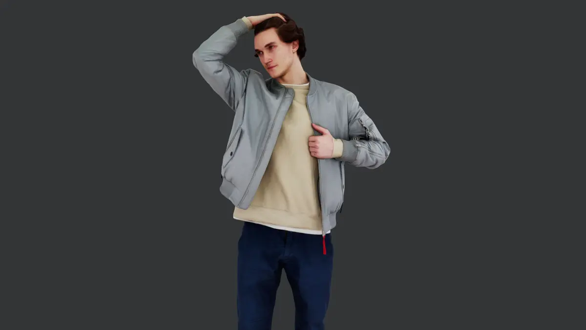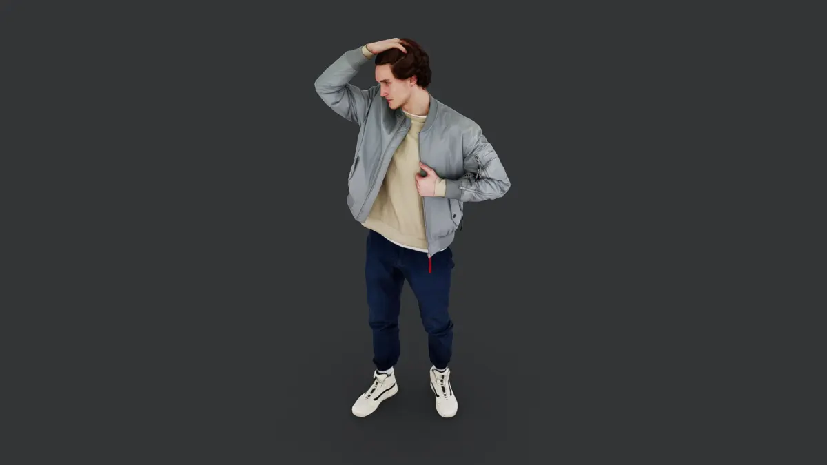 A trendy young man stands in a relaxed pose, adjusting his hair with one hand while casually holding his jacket with the other. He wears a light bomber jacket over a beige sweatshirt, paired with dark blue jogger-style pants and white high-top sneakers. His confident and effortless look makes him ideal for modern urban scenes, fashion showcases, or lifestyle projects. The model includes multiple angles, adding depth and versatility to scene compositions.