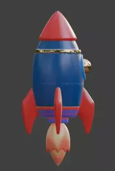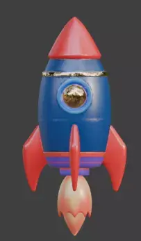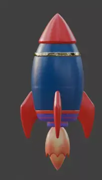A high-quality 3D cartoon model of a stylized fireworks rocket designed with a bold and playful aesthetic. The asset features a vibrant blue body paired with a bright red nose cone and tail fins, accented by a glowing golden central port with a neon blue frame. Depicted with a powerful orange and yellow flame trail, this model uses smooth, high-quality geometry to capture a high-energy celebratory feel, making it perfect for New Year-themed games, festive animations, or creative digital props.