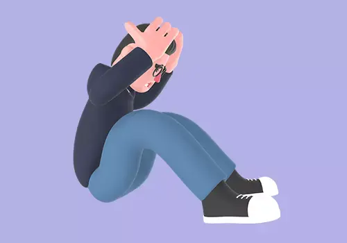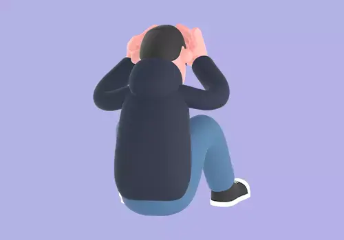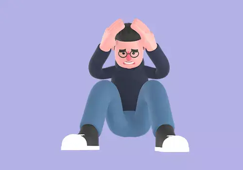 This stylized 3D male programmer character features a cartoon style man sitting on the floor, holding his head with both hands, showing extreme frustration or dizziness. Ideal for depicting stress, burnout, or overwhelming problems in tech, office, or coding related scenes.