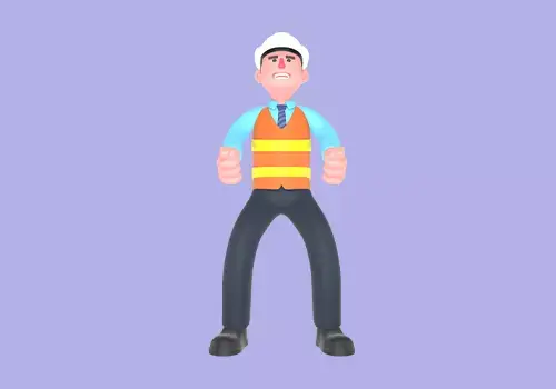 This stylized 3D male architect character features a cartoon style professional standing with his legs slightly apart and both fists clenched at his sides, showing an angry or determined expression. Perfect for construction-themed animations, motivational scenes, or projects that emphasize strength, focus, and determination.